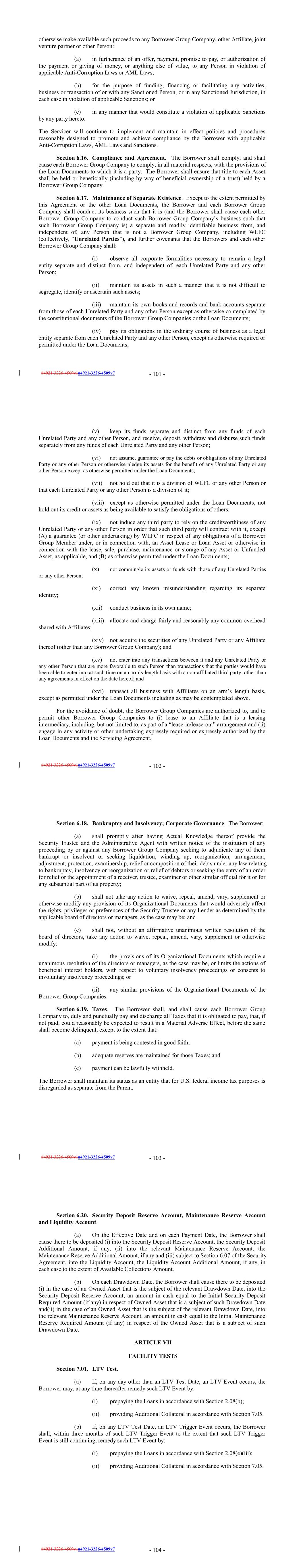 - 101 -#4921-3226-4509v1#4921-3226-4509v7 otherwise make available such proceeds to any Borrower Group Company, other Affiliate, joint venture partner or other Person: (a) in furtherance of an offer, payment, promise to pay, or authorization of the payment or giving of money, or anything else of value, to any Person in violation of applicable Anti-Corruption Laws or AML Laws; (b) for the purpose of funding, financing or facilitating any activities, business or transaction of or with any Sanctioned Person, or in any Sanctioned Jurisdiction, in each case in violation of applicable Sanctions; or (c) in any manner that would constitute a violation of applicable Sanctions by any party hereto. The Servicer will continue to implement and maintain in effect policies and procedures reasonably designed to promote and achieve compliance by the Borrower with applicable Anti-Corruption Laws, AML Laws and Sanctions. Section 6.16. Compliance and Agreement. The Borrower shall comply, and shall cause each Borrower Group Company to comply, in all material respects, with the provisions of the Loan Documents to which it is a party. The Borrower shall ensure that title to each Asset shall be held or beneficially (including by way of beneficial ownership of a trust) held by a Borrower Group Company. Section 6.17. Maintenance of Separate Existence. Except to the extent permitted by this Agreement or the other Loan Documents, the Borrower and each Borrower Group Company shall conduct its business such that it is (and the Borrower shall cause each other Borrower Group Company to conduct such Borrower Group Company’s business such that such Borrower Group Company is) a separate and readily identifiable business from, and independent of, any Person that is not a Borrower Group Company, including WLFC (collectively, “Unrelated Parties”), and further covenants that the Borrowers and each other Borrower Group Company shall: (i) observe all corporate formalities necessary to remain a legal entity separate and distinct from, and independent of, each Unrelated Party and any other Person; (ii) maintain its assets in such a manner that it is not difficult to segregate, identify or ascertain such assets; (iii) maintain its own books and records and bank accounts separate from those of each Unrelated Party and any other Person except as otherwise contemplated by the constitutional documents of the Borrower Group Companies or the Loan Documents; (iv) pay its obligations in the ordinary course of business as a legal entity separate from each Unrelated Party and any other Person, except as otherwise required or permitted under the Loan Documents; - 102 -#4921-3226-4509v1#4921-3226-4509v7 (v) keep its funds separate and distinct from any funds of each Unrelated Party and any other Person, and receive, deposit, withdraw and disburse such funds separately from any funds of each Unrelated Party and any other Person; (vi) not assume, guarantee or pay the debts or obligations of any Unrelated Party or any other Person or otherwise pledge its assets for the benefit of any Unrelated Party or any other Person except as otherwise permitted under the Loan Documents; (vii) not hold out that it is a division of WLFC or any other Person or that each Unrelated Party or any other Person is a division of it; (viii) except as otherwise permitted under the Loan Documents, not hold out its credit or assets as being available to satisfy the obligations of others; (ix) not induce any third party to rely on the creditworthiness of any Unrelated Party or any other Person in order that such third party will contract with it, except (A) a guarantee (or other undertaking) by WLFC in respect of any obligations of a Borrower Group Member under, or in connection with, an Asset Lease or Loan Asset or otherwise in connection with the lease, sale, purchase, maintenance or storage of any Asset or Unfunded Asset, as applicable, and (B) as otherwise permitted under the Loan Documents; (x) not commingle its assets or funds with those of any Unrelated Parties or any other Person; (xi) correct any known misunderstanding regarding its separate identity; (xii) conduct business in its own name; (xiii) allocate and charge fairly and reasonably any common overhead shared with Affiliates; (xiv) not acquire the securities of any Unrelated Party or any Affiliate thereof (other than any Borrower Group Company); and (xv) not enter into any transactions between it and any Unrelated Party or any other Person that are more favorable to such Person than transactions that the parties would have been able to enter into at such time on an arm’s-length basis with a non-affiliated third party, other than any agreements in effect on the date hereof; and (xvi) transact all business with Affiliates on an arm’s length basis, except as permitted under the Loan Documents including as may be contemplated above. For the avoidance of doubt, the Borrower Group Companies are authorized to, and to permit other Borrower Group Companies to (i) lease to an Affiliate that is a leasing intermediary, including, but not limited to, as part of a “lease-in/lease-out” arrangement and (ii) engage in any activity or other undertaking expressly required or expressly authorized by the Loan Documents and the Servicing Agreement. - 103 -#4921-3226-4509v1#4921-3226-4509v7 Section 6.18. Bankruptcy and Insolvency; Corporate Governance. The Borrower: (a) shall promptly after having Actual Knowledge thereof provide the Security Trustee and the Administrative Agent with written notice of the institution of any proceeding by or against any Borrower Group Company seeking to adjudicate any of them bankrupt or insolvent or seeking liquidation, winding up, reorganization, arrangement, adjustment, protection, examinership, relief or composition of their debts under any law relating to bankruptcy, insolvency or reorganization or relief of debtors or seeking the entry of an order for relief or the appointment o