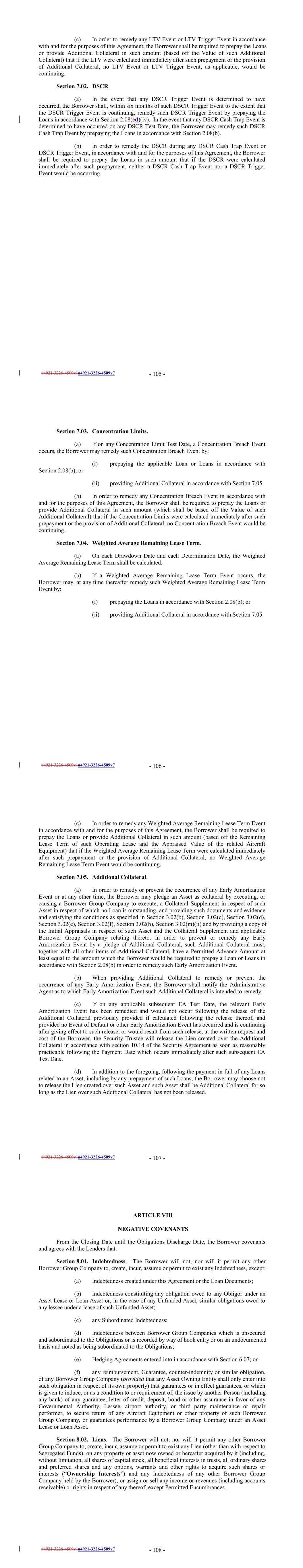 - 105 -#4921-3226-4509v1#4921-3226-4509v7 (c) In order to remedy any LTV Event or LTV Trigger Event in accordance with and for the purposes of this Agreement, the Borrower shall be required to prepay the Loans or provide Additional Collateral in such amount (based off the Value of such Additional Collateral) that if the LTV were calculated immediately after such prepayment or the provision of Additional Collateral, no LTV Event or LTV Trigger Event, as applicable, would be continuing. Section 7.02. DSCR. (a) In the event that any DSCR Trigger Event is determined to have occurred, the Borrower shall, within six months of such DSCR Trigger Event to the extent that the DSCR Trigger Event is continuing, remedy such DSCR Trigger Event by prepaying the Loans in accordance with Section 2.08(ed)(iv). In the event that any DSCR Cash Trap Event is determined to have occurred on any DSCR Test Date, the Borrower may remedy such DSCR Cash Trap Event by prepaying the Loans in accordance with Section 2.08(b). (b) In order to remedy the DSCR during any DSCR Cash Trap Event or DSCR Trigger Event, in accordance with and for the purposes of this Agreement, the Borrower shall be required to prepay the Loans in such amount that if the DSCR were calculated immediately after such prepayment, neither a DSCR Cash Trap Event nor a DSCR Trigger Event would be occurring. - 106 -#4921-3226-4509v1#4921-3226-4509v7 Section 7.03. Concentration Limits. (a) If on any Concentration Limit Test Date, a Concentration Breach Event occurs, the Borrower may remedy such Concentration Breach Event by: (i) prepaying the applicable Loan or Loans in accordance with Section 2.08(b); or (ii) providing Additional Collateral in accordance with Section 7.05. (b) In order to remedy any Concentration Breach Event in accordance with and for the purposes of this Agreement, the Borrower shall be required to prepay the Loans or provide Additional Collateral in such amount (which shall be based off the Value of such Additional Collateral) that if the Concentration Limits were calculated immediately after such prepayment or the provision of Additional Collateral, no Concentration Breach Event would be continuing. Section 7.04. Weighted Average Remaining Lease Term. (a) On each Drawdown Date and each Determination Date, the Weighted Average Remaining Lease Term shall be calculated. (b) If a Weighted Average Remaining Lease Term Event occurs, the Borrower may, at any time thereafter remedy such Weighted Average Remaining Lease Term Event by: (i) prepaying the Loans in accordance with Section 2.08(b); or (ii) providing Additional Collateral in accordance with Section 7.05. - 107 -#4921-3226-4509v1#4921-3226-4509v7 (c) In order to remedy any Weighted Average Remaining Lease Term Event in accordance with and for the purposes of this Agreement, the Borrower shall be required to prepay the Loans or provide Additional Collateral in such amount (based off the Remaining Lease Term of such Operating Lease and the Appraised Value of the related Aircraft Equipment) that if the Weighted Average Remaining Lease Term were calculated immediately after such prepayment or the provision of Additional Collateral, no Weighted Average Remaining Lease Term Event would be continuing. Section 7.05. Additional Collateral. (a) In order to remedy or prevent the occurrence of any Early Amortization Event or at any other time, the Borrower may pledge an Asset as collateral by executing, or causing a Borrower Group Company to execute, a Collateral Supplement in respect of such Asset in respect of which no Loan is outstanding, and providing such documents and evidence and satisfying the conditions as specified in Section 3.02(b), Section 3.02(c), Section 3.02(d), Section 3.02(e), Section 3.02(f), Section 3.02(h), Section 3.02(m)(ii) and by providing a copy of the Initial Appraisals in respect of such Asset and the Collateral Supplement and applicable Borrower Group Company relating thereto. In order to prevent or remedy any Early Amortization Event by a pledge of Additional Collateral, such Additional Collateral must, together with all other items of Additional Collateral, have a Permitted Advance Amount at least equal to the amount which the Borrower would be required to prepay a Loan or Loans in accordance with Section 2.08(b) in order to remedy such Early Amortization Event. (b) When providing Additional Collateral to remedy or prevent the occurrence of any Early Amortization Event, the Borrower shall notify the Administrative Agent as to which Early Amortization Event such Additional Collateral is intended to remedy. (c) If on any applicable subsequent EA Test Date, the relevant Early Amortization Event has been remedied and would not occur following the release of the Additional Collateral previously provided if calculated following the release thereof, and provided no Event of Default or other Early Amortization Event has occurred and is continuing after giving effect to such release, or would result from such release, at the written request and cost of the Borrower, the Security Trustee will release the Lien created over the Additional Collateral in accordance with section 10.14 of the Security Agreement as soon as reasonably practicable following the Payment Date which occurs immediately after such subsequent EA Test Date. (d) In addition to the foregoing, following the payment in full of any Loans related to an Asset, including by any prepayment of such Loans, the Borrower may choose not to release the Lien created over such Asset and such Asset shall be Additional Collateral for so long as the Lien over such Additional Collateral has not been released. - 108 -#4921-3226-4509v1#4921-3226-4509v7 ARTICLE VIII NEGATIVE COVENANTS From the Closing Date until the Obligations Discharge Date, the Borrower covenants and agrees with the Lenders that: Section 8.01. Indebtedness. The Borrower will not, nor will it permit any other Borrower Group Company to, create, incur, assume o
