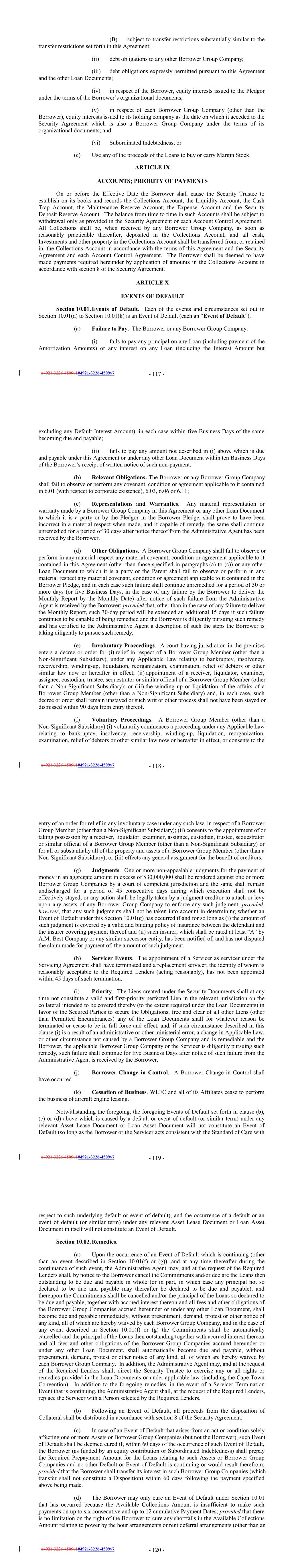 - 117 -#4921-3226-4509v1#4921-3226-4509v7 (B) subject to transfer restrictions substantially similar to the transfer restrictions set forth in this Agreement; (ii) debt obligations to any other Borrower Group Company; (iii) debt obligations expressly permitted pursuant to this Agreement and the other Loan Documents; (iv) in respect of the Borrower, equity interests issued to the Pledgor under the terms of the Borrower’s organizational documents; (v) in respect of each Borrower Group Company (other than the Borrower), equity interests issued to its holding company as the date on which it acceded to the Security Agreement which is also a Borrower Group Company under the terms of its organizational documents; and (vi) Subordinated Indebtedness; or (c) Use any of the proceeds of the Loans to buy or carry Margin Stock. ARTICLE IX ACCOUNTS; PRIORITY OF PAYMENTS On or before the Effective Date the Borrower shall cause the Security Trustee to establish on its books and records the Collections Account, the Liquidity Account, the Cash Trap Account, the Maintenance Reserve Account, the Expense Account and the Security Deposit Reserve Account. The balance from time to time in such Accounts shall be subject to withdrawal only as provided in the Security Agreement or each Account Control Agreement. All Collections shall be, when received by any Borrower Group Company, as soon as reasonably practicable thereafter, deposited in the Collections Account, and all cash, Investments and other property in the Collections Account shall be transferred from, or retained in, the Collections Account in accordance with the terms of this Agreement and the Security Agreement and each Account Control Agreement. The Borrower shall be deemed to have made payments required hereunder by application of amounts in the Collections Account in accordance with section 8 of the Security Agreement. ARTICLE X EVENTS OF DEFAULT Section 10.01. Events of Default. Each of the events and circumstances set out in Section 10.01(a) to Section 10.01(k) is an Event of Default (each an “Event of Default”). (a) Failure to Pay. The Borrower or any Borrower Group Company: (i) fails to pay any principal on any Loan (including payment of the Amortization Amounts) or any interest on any Loan (including the Interest Amount but - 118 -#4921-3226-4509v1#4921-3226-4509v7 excluding any Default Interest Amount), in each case within five Business Days of the same becoming due and payable; (ii) fails to pay any amount not described in (i) above which is due and payable under this Agreement or under any other Loan Document within ten Business Days of the Borrower’s receipt of written notice of such non-payment. (b) Relevant Obligations. The Borrower or any Borrower Group Company shall fail to observe or perform any covenant, condition or agreement applicable to it contained in 6.01 (with respect to corporate existence), 6.03, 6.06 or 6.11; (c) Representations and Warranties. Any material representation or warranty made by a Borrower Group Company in this Agreement or any other Loan Document to which it is a party or by the Pledgor in the Borrower Pledge, shall prove to have been incorrect in a material respect when made, and if capable of remedy, the same shall continue unremedied for a period of 30 days after notice thereof from the Administrative Agent has been received by the Borrower. (d) Other Obligations. A Borrower Group Company shall fail to observe or perform in any material respect any material covenant, condition or agreement applicable to it contained in this Agreement (other than those specified in paragraphs (a) to (c)) or any other Loan Document to which it is a party or the Parent shall fail to observe or perform in any material respect any material covenant, condition or agreement applicable to it contained in the Borrower Pledge, and in each case such failure shall continue unremedied for a period of 30 or more days (or five Business Days, in the case of any failure by the Borrower to deliver the Monthly Report by the Monthly Date) after notice of such failure from the Administrative Agent is received by the Borrower; provided that, other than in the case of any failure to deliver the Monthly Report, such 30-day period will be extended an additional 15 days if such failure continues to be capable of being remedied and the Borrower is diligently pursuing such remedy and has certified to the Administrative Agent a description of such the steps the Borrower is taking diligently to pursue such remedy. (e) Involuntary Proceedings. A court having jurisdiction in the premises enters a decree or order for (i) relief in respect of a Borrower Group Member (other than a Non-Significant Subsidiary), under any Applicable Law relating to bankruptcy, insolvency, receivership, winding-up, liquidation, reorganization, examination, relief of debtors or other similar law now or hereafter in effect; (ii) appointment of a receiver, liquidator, examiner, assignee, custodian, trustee, sequestrator or similar official of a Borrower Group Member (other than a Non-Significant Subsidiary); or (iii) the winding up or liquidation of the affairs of a Borrower Group Member (other than a Non-Significant Subsidiary) and, in each case, such decree or order shall remain unstayed or such writ or other process shall not have been stayed or dismissed within 90 days from entry thereof. (f) Voluntary Proceedings. A Borrower Group Member (other than a Non-Significant Subsidiary) (i) voluntarily commences a proceeding under any Applicable Law relating to bankruptcy, insolvency, receivership, winding-up, liquidation, reorganization, examination, relief of debtors or other similar law now or hereafter in effect, or consents to the - 119 -#4921-3226-4509v1#4921-3226-4509v7 entry of an order for relief in any involuntary case under any such law, in respect of a Borrower Group Member (other than a Non-Significant Subsidiary); (ii) consents to the appointment of or taking posse