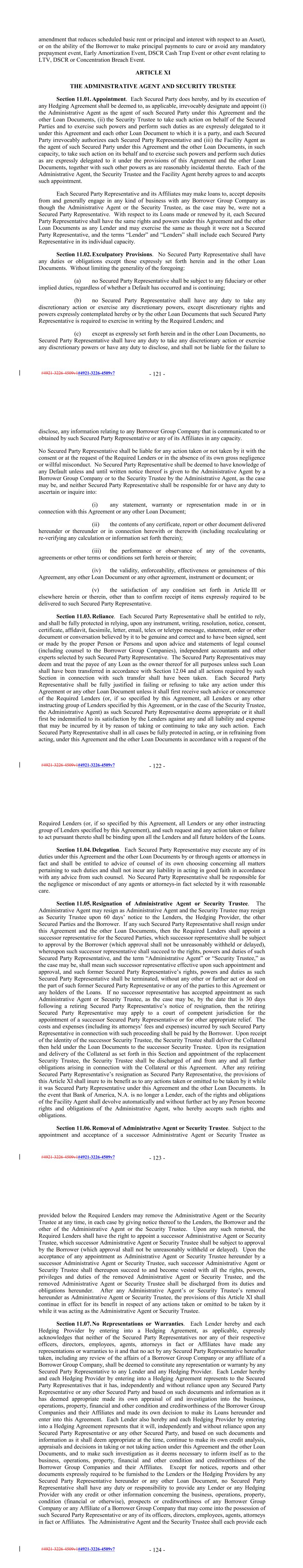 - 121 -#4921-3226-4509v1#4921-3226-4509v7 amendment that reduces scheduled basic rent or principal and interest with respect to an Asset), or on the ability of the Borrower to make principal payments to cure or avoid any mandatory prepayment event, Early Amortization Event, DSCR Cash Trap Event or other event relating to LTV, DSCR or Concentration Breach Event. ARTICLE XI THE ADMINISTRATIVE AGENT AND SECURITY TRUSTEE Section 11.01. Appointment. Each Secured Party does hereby, and by its execution of any Hedging Agreement shall be deemed to, as applicable, irrevocably designate and appoint (i) the Administrative Agent as the agent of such Secured Party under this Agreement and the other Loan Documents, (ii) the Security Trustee to take such action on behalf of the Secured Parties and to exercise such powers and perform such duties as are expressly delegated to it under this Agreement and each other Loan Document to which it is a party, and each Secured Party irrevocably authorizes each Secured Party Representative and (iii) the Facility Agent as the agent of such Secured Party under this Agreement and the other Loan Documents, in such capacity, to take such action on its behalf and to exercise such powers and perform such duties as are expressly delegated to it under the provisions of this Agreement and the other Loan Documents, together with such other powers as are reasonably incidental thereto. Each of the Administrative Agent, the Security Trustee and the Facility Agent hereby agrees to and accepts such appointment. Each Secured Party Representative and its Affiliates may make loans to, accept deposits from and generally engage in any kind of business with any Borrower Group Company as though the Administrative Agent or the Security Trustee, as the case may be, were not a Secured Party Representative. With respect to its Loans made or renewed by it, each Secured Party Representative shall have the same rights and powers under this Agreement and the other Loan Documents as any Lender and may exercise the same as though it were not a Secured Party Representative, and the terms “Lender” and “Lenders” shall include each Secured Party Representative in its individual capacity. Section 11.02. Exculpatory Provisions. No Secured Party Representative shall have any duties or obligations except those expressly set forth herein and in the other Loan Documents. Without limiting the generality of the foregoing: (a) no Secured Party Representative shall be subject to any fiduciary or other implied duties, regardless of whether a Default has occurred and is continuing; (b) no Secured Party Representative shall have any duty to take any discretionary action or exercise any discretionary powers, except discretionary rights and powers expressly contemplated hereby or by the other Loan Documents that such Secured Party Representative is required to exercise in writing by the Required Lenders; and (c) except as expressly set forth herein and in the other Loan Documents, no Secured Party Representative shall have any duty to take any discretionary action or exercise any discretionary powers or have any duty to disclose, and shall not be liable for the failure to - 122 -#4921-3226-4509v1#4921-3226-4509v7 disclose, any information relating to any Borrower Group Company that is communicated to or obtained by such Secured Party Representative or any of its Affiliates in any capacity. No Secured Party Representative shall be liable for any action taken or not taken by it with the consent or at the request of the Required Lenders or in the absence of its own gross negligence or willful misconduct. No Secured Party Representative shall be deemed to have knowledge of any Default unless and until written notice thereof is given to the Administrative Agent by a Borrower Group Company or to the Security Trustee by the Administrative Agent, as the case may be, and neither Secured Party Representative shall be responsible for or have any duty to ascertain or inquire into: (i) any statement, warranty or representation made in or in connection with this Agreement or any other Loan Document; (ii) the contents of any certificate, report or other document delivered hereunder or thereunder or in connection herewith or therewith (including recalculating or re-verifying any calculation or information set forth therein); (iii) the performance or observance of any of the covenants, agreements or other terms or conditions set forth herein or therein; (iv) the validity, enforceability, effectiveness or genuineness of this Agreement, any other Loan Document or any other agreement, instrument or document; or (v) the satisfaction of any condition set forth in Article III or elsewhere herein or therein, other than to confirm receipt of items expressly required to be delivered to such Secured Party Representative. Section 11.03. Reliance. Each Secured Party Representative shall be entitled to rely, and shall be fully protected in relying, upon any instrument, writing, resolution, notice, consent, certificate, affidavit, facsimile, letter, email, telex or teletype message, statement, order or other document or conversation believed by it to be genuine and correct and to have been signed, sent or made by the proper Person or Persons and upon advice and statements of legal counsel (including counsel to the Borrower Group Companies), independent accountants and other experts selected by such Secured Party Representative. The Secured Party Representatives may deem and treat the payee of any Loan as the owner thereof for all purposes unless such Loan shall have been transferred in accordance with Section 12.04 and all actions required by such Section in connection with such transfer shall have been taken. Each Secured Party Representative shall be fully justified in failing or refusing to take any action under this Agreement or any other Loan Document unless it shall first receive such advice or concurrence of the Required Lenders (