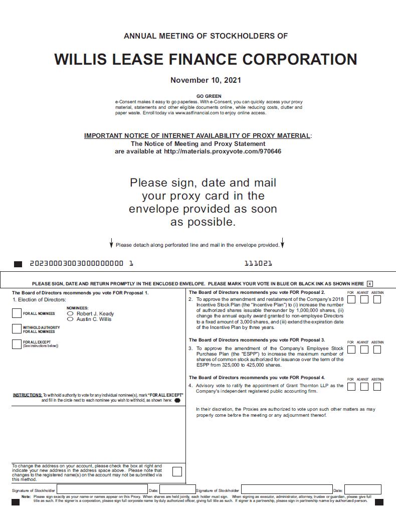 ANNUAL MEETING OF STOCKHOLDERS OF WILLIS LEASE FINANCE CORPORATION November 10, 2021 GO GREEN e-Consent makes it easy to go paperless. With e-Consent, you can quickly access your proxy material, statements and other eligible documents online, while reducing costs, clutter and paper waste. Enroll today via www.astfinancial.com to enjoy online access. IMPORTANT NOTICE OF INTERNET AVAILABILITY OF PROXY MATERIAL: The Notice of Meeting and Proxy Statement are available at http://materials.proxyvote.com/970646 Please sign, date and mail your proxy card in the envelope provided as soon as possible. Please detach along perforated line and mail in the envelope provided. 20230003003000000000 1 111021 PLEASE SIGN, DATE AND RETURN PROMPTLY IN THE ENCLOSED ENVELOPE. PLEASE MARK YOUR VOTE IN BLUE OR BLACK INK AS SHOWN HERE The Board of Directors recommends you vote FOR Proposal 1. 1. Election of Directors: FOR ALL NOMINEES WITHHOLD AUTHORITY FOR ALL NOMINEES FOR ALL EXCEPT (See instructions below)) NOMINEES: Robert J. Keady Austin C. Willis INSTRUCTIONS: To withhold authority to vote for any individual nominee(s), mark “FOR ALL EXCEPT” and fill in the circle next to each nominee you wish to withhold, as shown here: To change the address on your account, please check the box at right and indicate your new address in the address space above. Please note that changes to the registered name(s) on the account may not be submitted via this method. The Board of Directors recommends you vote FOR Proposal 2. For Against Abstain 2. To approve the amendment and restatement of the Company’s 2018 Incentive Stock Plan (the “Incentive Plan”) to (i) increase the number of authorized shares issuable thereunder by 1,000,000 shares, (ii) change the annual equity award granted to non-employee Directors to a fixed amount of 3,000 shares, and (iii) extend the expiration date of the Incentive Plan by three years. The Board of Directors recommends you vote FOR Proposal 3. For Against Abstain 3. To approve the amendment of the Company’s Employee Stock Purchase Plan (the “ESPP”) to increase the maximum number of shares of common stock authorized for issuance over the term of the ESPP from 325,000 to 425,000 shares. The Board of Directors recommends you vote FOR Proposal 4. For Against Abstain 4. Advisory vote to ratify the appointment of Grant Thornton LLP as the Company's independent registered public accounting firm. In their discretion, the Proxies are authorized to vote upon such other matters as may properly come before the meeting or any adjournment thereof. Signature of Stockholder Date: Signature of Stockholder Date: Note: Please sign exactly as your name or names appear on this Proxy. When shares are held jointly, each holder must sign. When signing as executor, administrator, attorney, trustee or guardian, please give full title as such. If the signer is a corporation, please sign full corporate name by duly authorized officer, giving full title as such. If signer is a partnership, please sign in partnership name by authorized person.