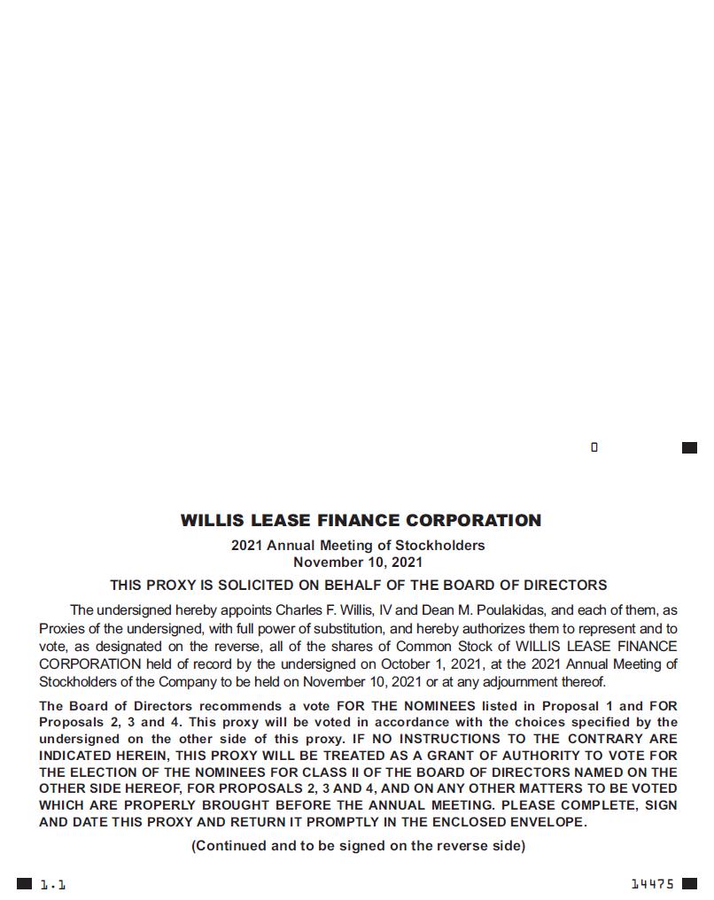 WILLIS LEASE FINANCE CORPORATION 2021 Annual Meeting of Stockholders November 10, 2021 THIS PROXY IS SOLICITED ON BEHALF OF THE BOARD OF DIRECTORS The undersigned hereby appoints Charles F. Willis, IV and Dean M. Poulakidas, and each of them, as Proxies of the undersigned, with full power of substitution, and hereby authorizes them to represent and to vote, as designated on the reverse, all of the shares of Common Stock of WILLIS LEASE FINANCE CORPORATION held of record by the undersigned on October 1, 2021, at the 2021 Annual Meeting of Stockholders of the Company to be held on November 10, 2021 or at any adjournment thereof. The Board of Directors recommends a vote FOR THE NOMINEES listed in Proposal 1 and FOR Proposals 2, 3 and 4. This proxy will be voted in accordance with the choices specified by the undersigned on the other side of this proxy. IF NO INSTRUCTIONS TO THE CONTRARY ARE INDICATED HEREIN, THIS PROXY WILL BE TREATED AS A GRANT OF AUTHORITY TO VOTE FOR THE ELECTION OF THE NOMINEES FOR CLASS II OF THE BOARD OF DIRECTORS NAMED ON THE OTHER SIDE HEREOF, FOR PROPOSALS 2, 3 AND 4, AND ON ANY OTHER MATTERS TO BE VOTED WHICH ARE PROPERLY BROUGHT BEFORE THE ANNUAL MEETING. PLEASE COMPLETE, SIGN AND DATE THIS PROXY AND RETURN IT PROMPTLY IN THE ENCLOSED ENVELOPE. (Continued and to be signed on the reverse side) 1.1 14475