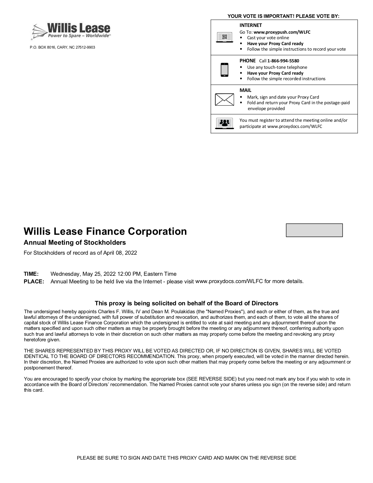 YOUR VOTE IS IMPORTANT! PLEASE VOTE BY: Willis Lease Finance Corporation Annual Meeting of Stockholders For Stockholders of record as of April 08, 2022 TIME: Wednesday, May 25, 2022 12:00 PM, Eastern Time PLACE: Annual Meeting to be held live via the Internet - please visit www.proxydocs.com/WLFC for more details. This proxy is being solicited on behalf of the Board of Directors The undersigned hereby appoints Charles F. Willis, IV and Dean M. Poulakidas (the "Named Proxies"), and each or either of them, as the true and lawful attorneys of the undersigned, with full power of substitution and revocation, and authorizes them, and each of them, to vote all the shares of capital stock of Willis Lease Finance Corporation which the undersigned is entitled to vote at said meeting and any adjournment thereof upon the matters specified and upon such other matters as may be properly brought before the meeting or any adjournment thereof, conferring authority upon such true and lawful attorneys to vote in their discretion on such other matters as may properly come before the meeting and revoking any proxy heretofore given. THE SHARES REPRESENTED BY THIS PROXY WILL BE VOTED AS DIRECTED OR, IF NO DIRECTION IS GIVEN, SHARES WILL BE VOTED IDENTICAL TO THE BOARD OF DIRECTORS RECOMMENDATION. This proxy, when properly executed, will be voted in the manner directed herein. In their discretion, the Named Proxies are authorized to vote upon such other matters that may properly come before the meeting or any adjournment or postponement thereof. You are encouraged to specify your choice by marking the appropriate box (SEE REVERSE SIDE) but you need not mark any box if you wish to vote in accordance with the Board of Directors’ recommendation. The Named Proxies cannot vote your shares unless you sign (on the reverse side) and return this card. PLEASE BE SURE TO SIGN AND DATE THIS PROXY CARD AND MARK ON THE REVERSE SIDE P.O. BOX 8016, CARY, NC 27512-9903 INTERNET Go To: www.proxypush.com/WLFC • Cast your vote online • Have your Proxy Card ready • Follow the simple instructions to record your vote PHONE Call 1-866-994-5580 • Use any touch-tone telephone • Have your Proxy Card ready • Follow the simple recorded instructions MAIL • Mark, sign and date your Proxy Card • Fold and return your Proxy Card in the postage-paid envelope provided You must register to attend the meeting online and/or participate at www.proxydocs.com/WLFC