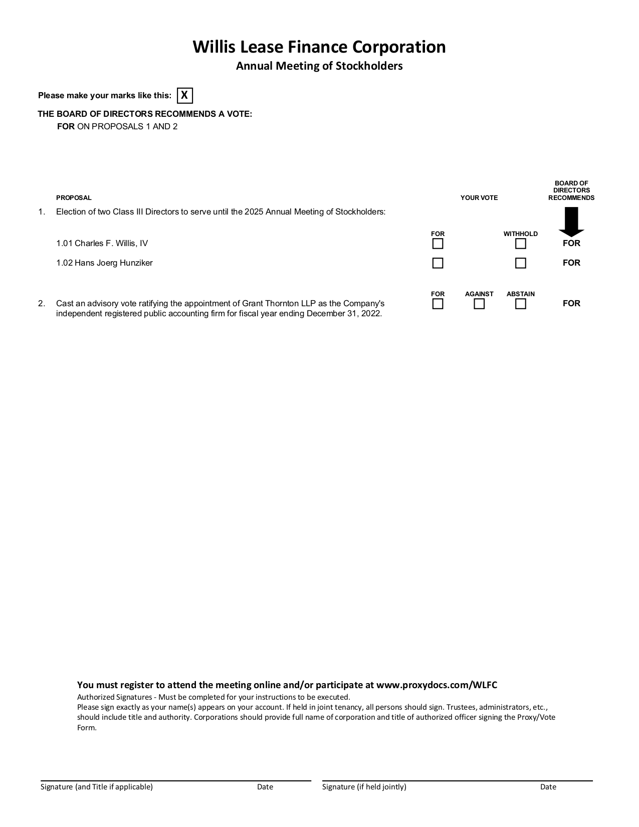 Willis Lease Finance Corporation Annual Meeting of Stockholders THE BOARD OF DIRECTORS RECOMMENDS A VOTE: FOR ON PROPOSALS 1 AND 2 PROPOSAL YOUR VOTE BOARD OF DIRECTORS RECOMMENDS 1. Election of two Class III Directors to serve until the 2025 Annual Meeting of Stockholders: FOR WITHHOLD 1.01 Charles F. Willis, IV #P2# #P2# FOR 1.02 Hans Joerg Hunziker #P3# #P3# FOR FOR AGAINST ABSTAIN 2. Cast an advisory vote ratifying the appointment of Grant Thornton LLP as the Company's independent registered public accounting firm for fiscal year ending December 31, 2022. #P4# #P4# #P4# FOR You must register to attend the meeting online and/or participate at www.proxydocs.com/WLFC Authorized Signatures - Must be completed for your instructions to be executed. Please sign exactly as your name(s) appears on your account. If held in joint tenancy, all persons should sign. Trustees, administrators, etc., should include title and authority. Corporations should provide full name of corporation and title of authorized officer signing the Proxy/Vote Form. Signature (and Title if applicable) Proposal Page – VIFL Date Signature (if held jointly) Date Please make your marks like this: X
