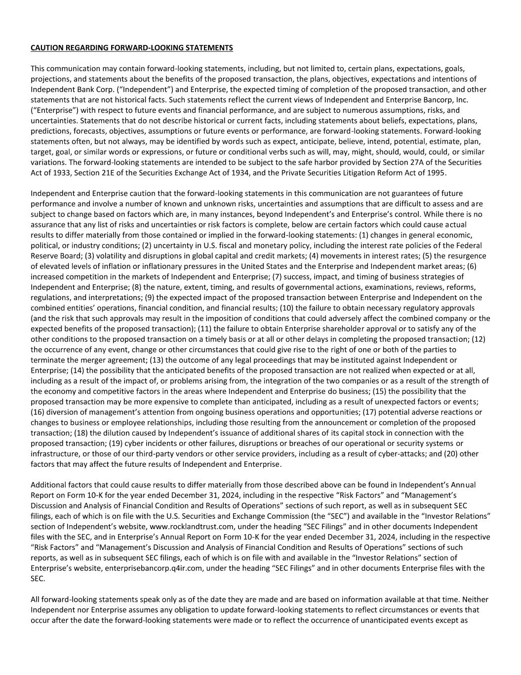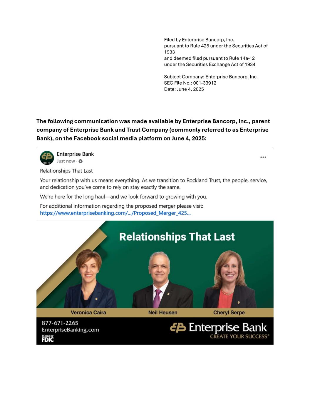 Filed by Enterprise Bancorp, Inc. pursuant to Rule 425 under the Securities Act of 1933 and deemed filed pursuant to Rule 14a-12 under the Securities Exchange Act of 1934 Subject Company: Enterprise Bancorp, Inc. SEC File No.: 001-33912 Date: June 4, 2025 The following communication was made available by Enterprise Bancorp, Inc., parent company of Enterprise Bank and Trust Company (commonly referred to as Enterprise Bank), on the Facebook social media platform on June 4, 2025: