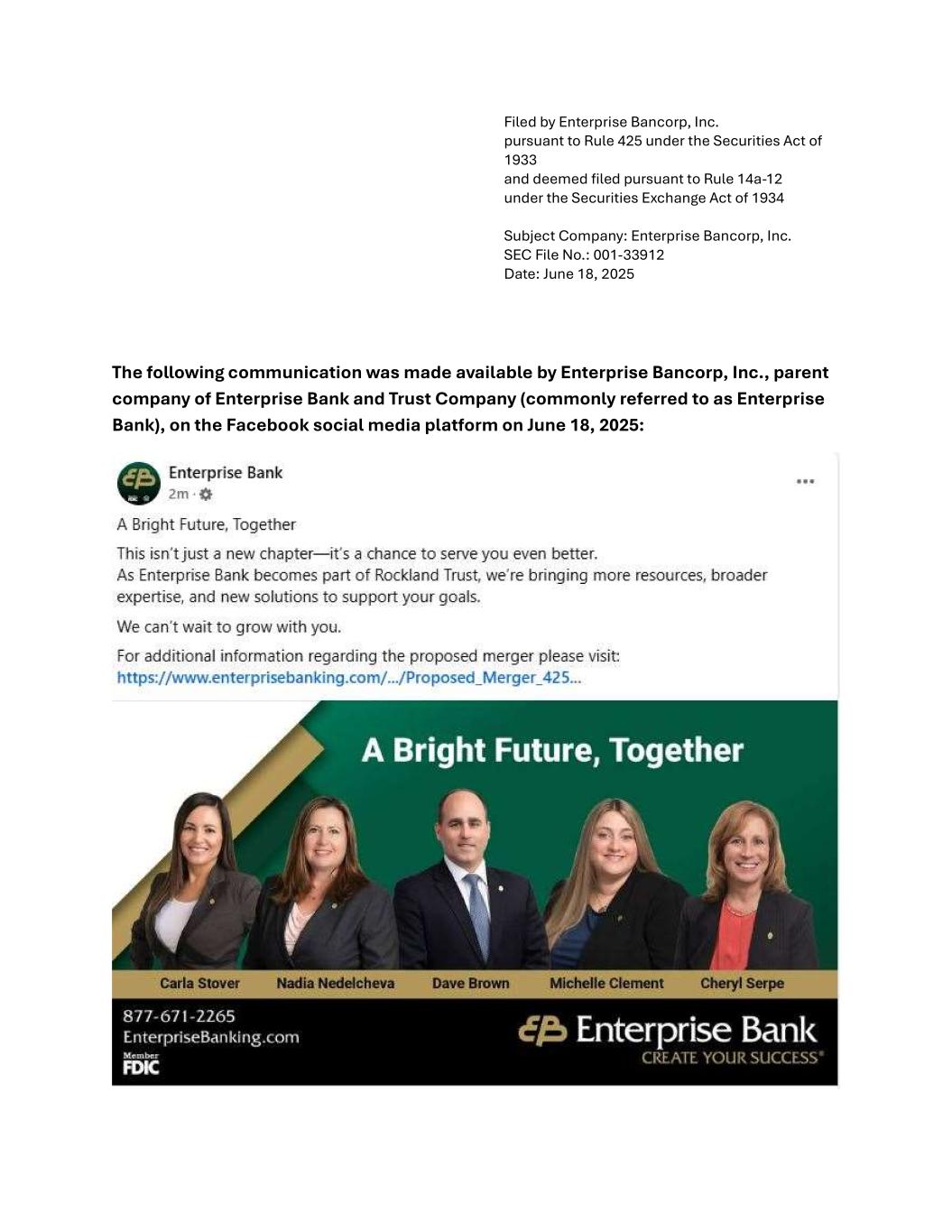 Filed by Enterprise Bancorp, Inc. pursuant to Rule 425 under the Securities Act of 1933 and deemed filed pursuant to Rule 14a-12 under the Securities Exchange Act of 1934 Subject Company: Enterprise Bancorp, Inc. SEC File No.: 001-33912 Date: June 18, 2025 The following communication was made available by Enterprise Bancorp, Inc., parent company of Enterprise Bank and Trust Company (commonly referred to as Enterprise Bank), on the Facebook social media platform on June 18, 2025: