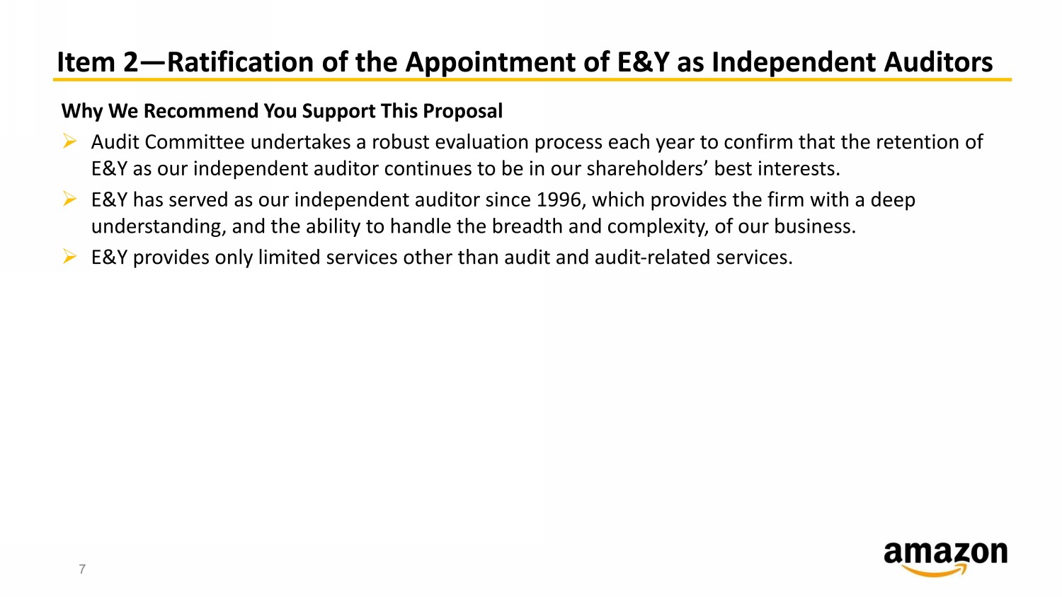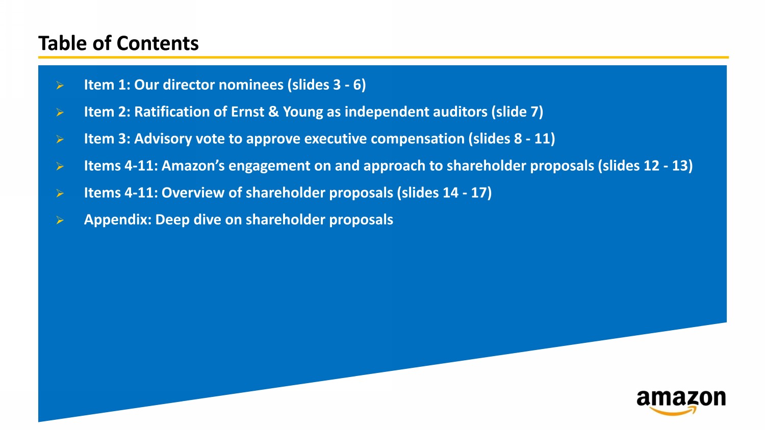 Table of Contents » Item 1: Our director nominees (slides 3 - 6) » Item 2: Ratification of Ernst & Young as independent auditors (slide 7) » Item 3: Advisory vote to approve executive compensation (slides 8 - 11) » Items 4 - 11: Amazon’s engagement on and approach to shareholder proposals (slides 12 - 13) » Items 4 - 11: Overview of shareholder proposals (slides 14 - 17) » Appendix: Deep dive on shareholder proposals