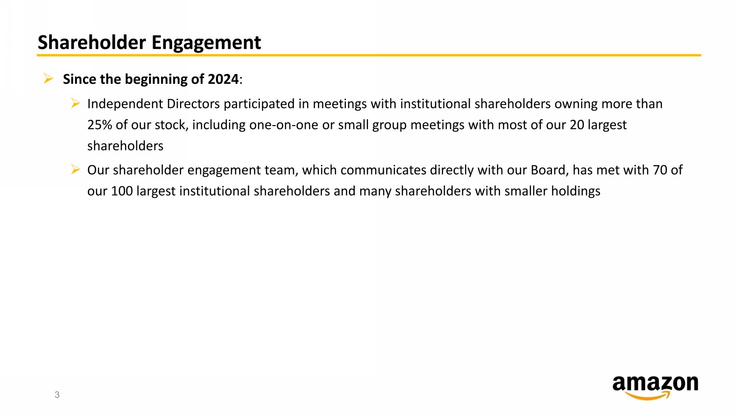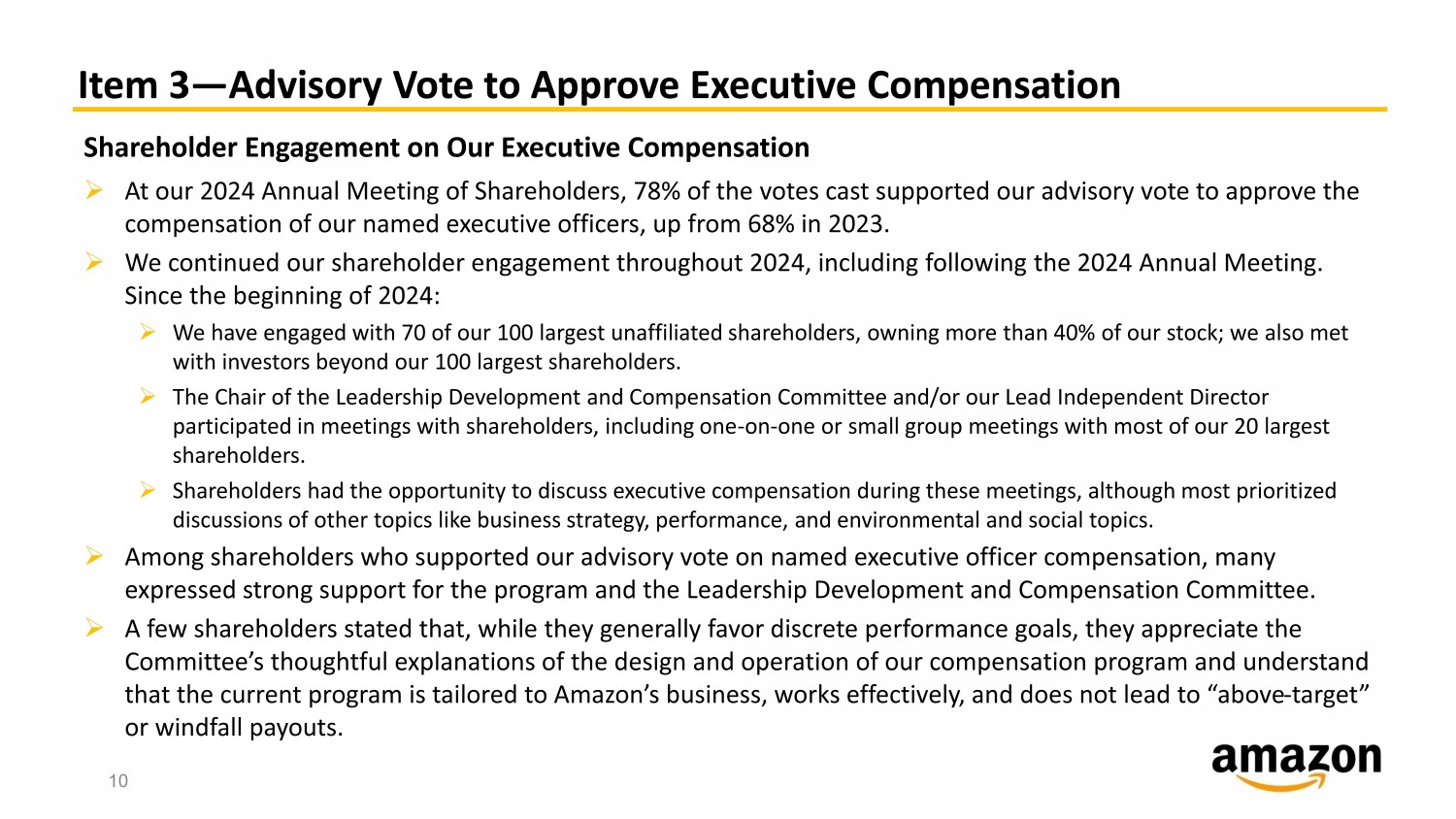 Item 3 — Advisory Vote to Approve Executive Compensation 10 Shareholder Engagement on Our Executive Compensation » At our 2024 Annual Meeting of Shareholders, 78% of the votes cast supported our advisory vote to approve the compensation of our named executive officers, up from 68% in 2023. » We continued our shareholder engagement throughout 2024, including following the 2024 Annual Meeting. Since the beginning of 2024: » We have engaged with 70 of our 100 largest unaffiliated shareholders, owning more than 40% of our stock; we also met with investors beyond our 100 largest shareholders. » The Chair of the Leadership Development and Compensation Committee and/or our Lead Independent Director participated in meetings with shareholders, including one - on - one or small group meetings with most of our 20 largest shareholders. » Shareholders had the opportunity to discuss executive compensation during these meetings, although most prioritized discussions of other topics like business strategy, performance, and environmental and social topics. » Among shareholders who supported our advisory vote on named executive officer compensation, many expressed strong support for the program and the Leadership Development and Compensation Committee. » A few shareholders stated that, while they generally favor discrete performance goals, they appreciate the Committee’s thoughtful explanations of the design and operation of our compensation program and understand that the current program is tailored to Amazon’s business, works effectively, and does not lead to “above - target” or windfall payouts.