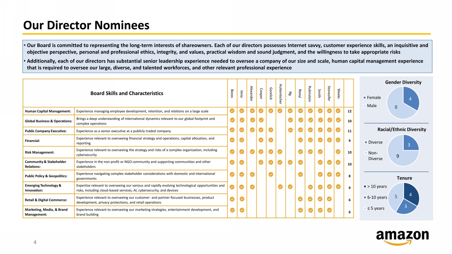 4 Our Director Nominees • Our Board is committed to representing the long - term interests of shareowners. Each of our directors possesses Internet savvy, c ustomer experience skills, an inquisitive and objective perspective, personal and professional ethics, integrity, and values, practical wisdom and sound judgment, and the wil lingness to take appropriate risks • Additionally, each of our directors has substantial senior leadership experience needed to oversee a company of our size and sca le, human capital management experience that is required to oversee our large, diverse, and talented workforces, and other relevant professional experience Weeks Stonesifer Smith Rubinstein Nooyi Ng Huttenlocher Gorelick Cooper Alexander Jassy Bezos Board Skills and Characteristics 12 Experience managing employee development, retention, and relations on a large scale Human Capital Management: 10 Brings a deep understanding of international dynamics relevant to our global footprint and complex operations Global Business & Operations: 11 Experience as a senior executive at a publicly traded company Public Company Executive: 9 Experience relevant to overseeing financial strategy and operations, capital allocation, and reporting Financial: 10 Experience relevant to overseeing the strategy and risks of a complex organization, including cybersecurity Risk Management: 10 Experience in the non - profit or NGO community and supporting communities and other stakeholders Community & Stakeholder Relations: 8 Experience navigating complex stakeholder considerations with domestic and international governments Public Policy & Geopolitics: 9 Expertise relevant to overseeing our various and rapidly evolving technological opportunities and risks, including cloud - based services, AI, cybersecurity, and devices Emerging Technology & Innovation: 6 Experience relevant to overseeing our customer - and partner - focused businesses, product development, privacy protections, and retail operations Retail & Digital Commerce: 6 Experience relevant to overseeing our marketing strategies, entertainment development, and brand building Marketing, Media, & Brand Management: 4 8 Gender Diversity Female Male 3 9 Racial/Ethnic Diversity Diverse Non- Diverse 4 3 5 Tenure > 10 years 6-10 years ≤ 5 years