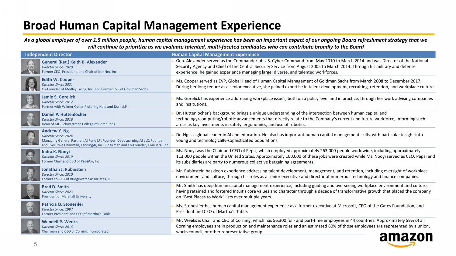 5 Broad Human Capital Management Experience Human Capital Management Experience Independent Director » Gen. Alexander served as the Commander of U.S. Cyber Command from May 2010 to March 2014 and was Director of the National Security Agency and Chief of the Central Security Service from August 2005 to March 2014. Through his military and defense experience, he gained experience managing large, diverse, and talented workforces. General (Ret.) Keith B. Alexander Director Since: 2020 Former CEO, President, and Chair of IronNet , Inc. » Ms. Cooper served as EVP, Global Head of Human Capital Management of Goldman Sachs from March 2008 to December 2017. During her long tenure as a senior executive, she gained expertise in talent development, recruiting, retention, and workplac e c ulture. Edith W. Cooper Director Since: 2021 Co - Founder of Medley Living, Inc. and Former EVP of Goldman Sachs » Ms. Gorelick has experience addressing workplace issues, both on a policy level and in practice, through her work advising co mpa nies and institutions. Jamie S. Gorelick Director Since: 2012 Partner with Wilmer Cutler Pickering Hale and Dorr LLP » Dr. Huttenlocher’s background brings a unique understanding of the intersection between human capital and technology/computing/robotic advancements that directly relate to the Company’s current and future workforce, informing such areas as key investments in safety, ergonomics, and use of robotics. Daniel P. Huttenlocher Director Since: 2016 Dean of MIT Schwarzman College of Computing » Dr. Ng is a global leader in AI and education. He also has important human capital management skills, with particular insight in to young and technologically - sophisticated populations. Andrew Y. Ng Director Since: 2024 Managing General Partner, AI Fund LP; Founder, DeepLearning.AI LLC; Founder and Executive Chairman, LandingAI , Inc.; Chairman and Co - Founder, Coursera, Inc. » Ms. Nooyi was the Chair and CEO of Pepsi, which employed approximately 263,000 people worldwide, including approximately 113,000 people within the United States. Approximately 100,000 of these jobs were created while Ms. Nooyi served as CEO. Peps i a nd its subsidiaries are party to numerous collective bargaining agreements. Indra K. Nooyi Director Since: 2019 Former Chair and CEO of PepsiCo, Inc. » Mr. Rubinstein has deep experience addressing talent development, management, and retention, including oversight of workplace environment and culture, through his roles as a senior executive and director at numerous technology and finance companies. Jonathan J. Rubinstein Director Since: 2010 Former co - CEO of Bridgewater Associates, LP » Mr. Smith has deep human capital management experience, including guiding and overseeing workplace environment and culture, having retained and fostered Intuit’s core values and character through a decade of transformative growth that placed the com pan y on “Best Places to Work” lists over multiple years. Brad D. Smith Director Since: 2023 President of Marshall University » Ms. Stonesifer has human capital management experience as a former executive at Microsoft, CEO of the Gates Foundation, and President and CEO of Martha’s Table. Patricia Q. Stonesifer Director Since: 1997 Former President and CEO of Martha’s Table » Mr. Weeks is Chair and CEO of Corning, which has 56,300 full - and part - time employees in 44 countries. Approximately 59% of all Corning employees are in production and maintenance roles and an estimated 60% of those employees are represented by a union, works council, or other representative group. Wendell P. Weeks Director Since: 2016 Chairman and CEO of Corning Incorporated As a global employer of over 1.5 million people, human capital management experience has been an important aspect of our ongo ing Board refreshment strategy that we will continue to prioritize as we evaluate talented, multi - faceted candidates who can contribute broadly to the Board