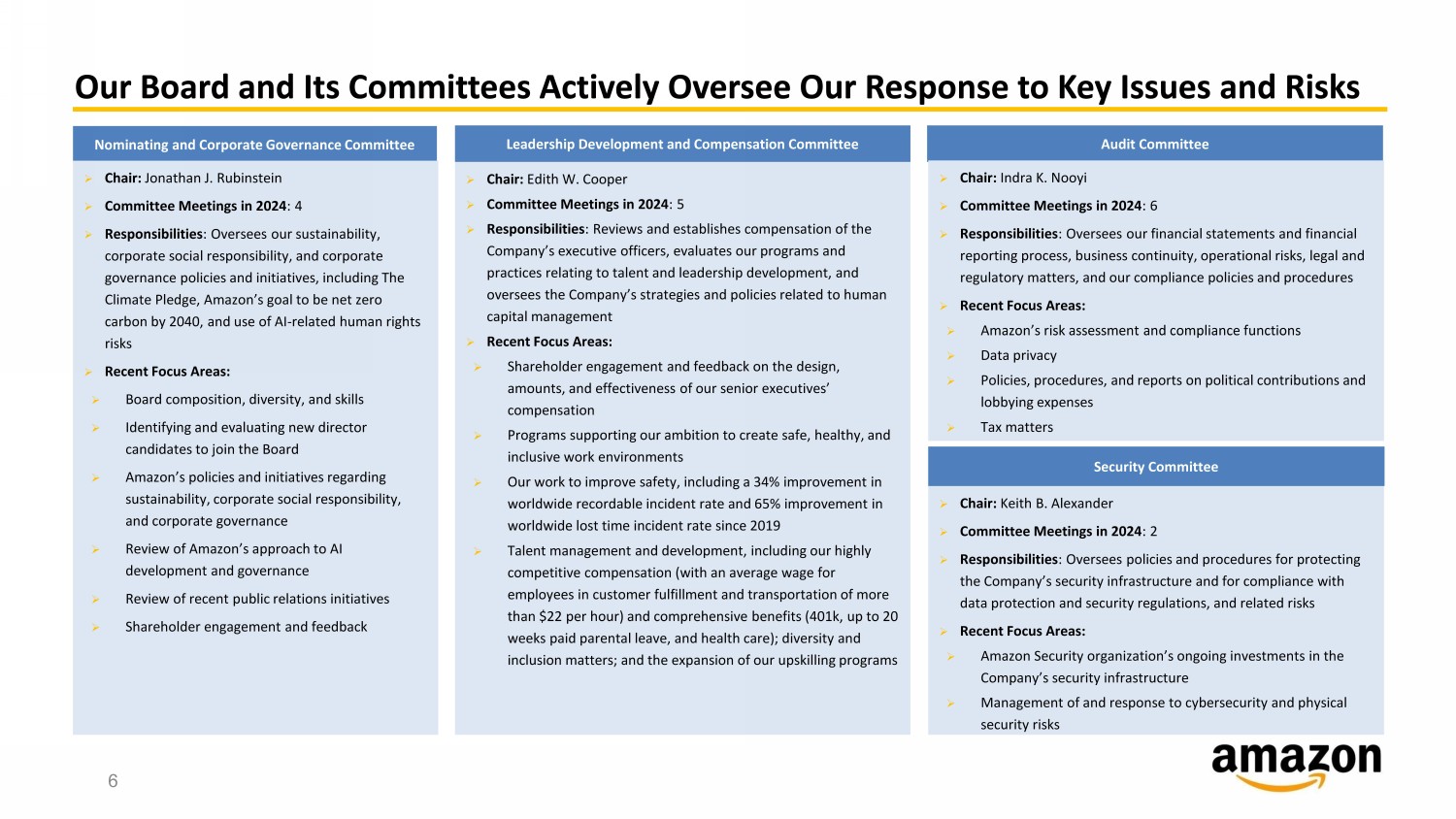 Our Board and Its Committees Actively Oversee Our Response to Key Issues and Risks 6 Nominating and Corporate Governance Committee Leadership Development and Compensation Committee Audit Committee » Chair: Jonathan J. Rubinstein » Committee Meetings in 2024 : 4 » Responsibilities : Oversees our sustainability, corporate social responsibility, and corporate governance policies and initiatives, including The Climate Pledge, Amazon’s goal to be net zero carbon by 2040, and use of AI - related human rights risks » Recent Focus Areas: » Board composition, diversity, and skills » Identifying and evaluating new director candidates to join the Board » Amazon’s policies and initiatives regarding sustainability, corporate social responsibility, and corporate governance » Review of Amazon’s approach to AI development and governance » Review of recent public relations initiatives » Shareholder engagement and feedback » Chair: Edith W. Cooper » Committee Meetings in 2024 : 5 » Responsibilities : Reviews and establishes compensation of the Company’s executive officers, evaluates our programs and practices relating to talent and leadership development, and oversees the Company’s strategies and policies related to human capital management » Recent Focus Areas: » Shareholder engagement and feedback on the design, amounts, and effectiveness of our senior executives’ compensation » Programs supporting our ambition to create safe, healthy, and inclusive work environments » Our work to improve safety, including a 34% improvement in worldwide recordable incident rate and 65% improvement in worldwide lost time incident rate since 2019 » Talent management and development, including our highly competitive compensation (with an average wage for employees in customer fulfillment and transportation of more than $22 per hour) and comprehensive benefits (401k, up to 20 weeks paid parental leave, and health care); diversity and inclusion matters; and the expansion of our upskilling programs » Chair: Indra K. Nooyi » Committee Meetings in 2024 : 6 » Responsibilities : Oversees our financial statements and financial reporting process, business continuity, operational risks, legal and regulatory matters, and our compliance policies and procedures » Recent Focus Areas: » Amazon’s risk assessment and compliance functions » Data privacy » Policies, procedures, and reports on political contributions and lobbying expenses » Tax matters » Chair: Keith B. Alexander » Committee Meetings in 2024 : 2 » Responsibilities : Oversees policies and procedures for protecting the Company’s security infrastructure and for compliance with data protection and security regulations, and related risks » Recent Focus Areas: » Amazon Security organization’s ongoing investments in the Company’s security infrastructure » Management of and response to cybersecurity and physical security risks Security Committee