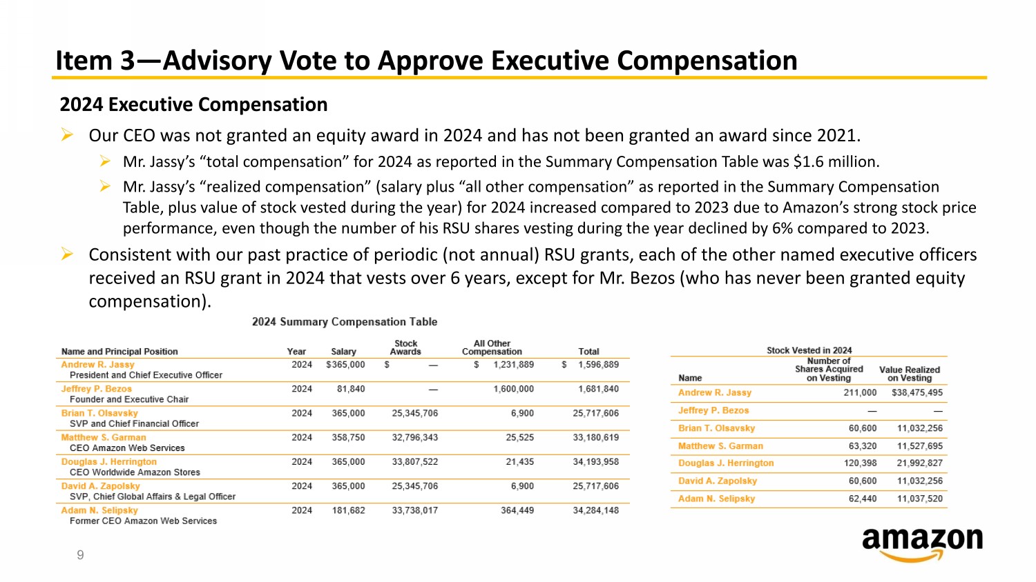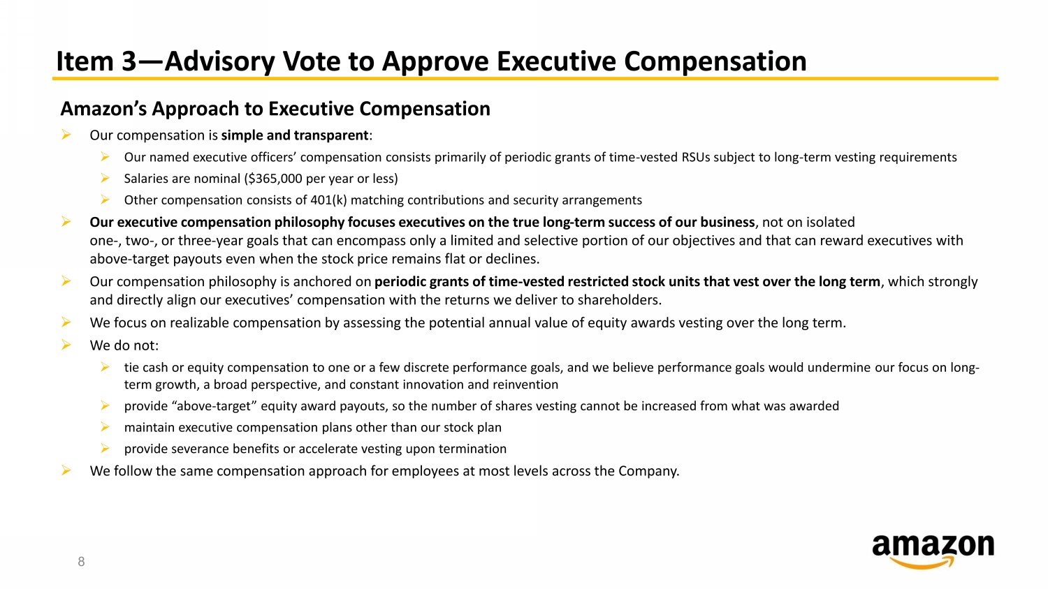 Amazon’s Approach to Executive Compensation » Our compensation is simple and transparent : » Our named executive officers’ compensation consists primarily of periodic grants of time - vested RSUs subject to long - term vestin g requirements » Salaries are nominal ($365,000 per year or less) » Other compensation consists of 401(k) matching contributions and security arrangements » Our executive compensation philosophy focuses executives on the true long - term success of our business , not on isolated one - , two - , or three - year goals that can encompass only a limited and selective portion of our objectives and that can reward ex ecutives with above - target payouts even when the stock price remains flat or declines. » Our compensation philosophy is anchored on periodic grants of time - vested restricted stock units that vest over the long term , which strongly and directly align our executives’ compensation with the returns we deliver to shareholders. » We focus on realizable compensation by assessing the potential annual value of equity awards vesting over the long term. » We do not: » tie cash or equity compensation to one or a few discrete performance goals, and we believe performance goals would undermine our focus on long - term growth, a broad perspective, and constant innovation and reinvention » provide “above - target” equity award payouts, so the number of shares vesting cannot be increased from what was awarded » maintain executive compensation plans other than our stock plan » provide severance benefits or accelerate vesting upon termination » We follow the same compensation approach for employees at most levels across the Company. 8 Item 3 — Advisory Vote to Approve Executive Compensation