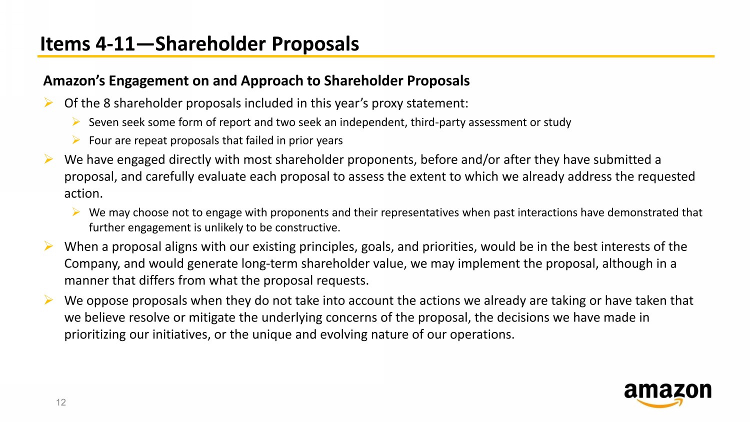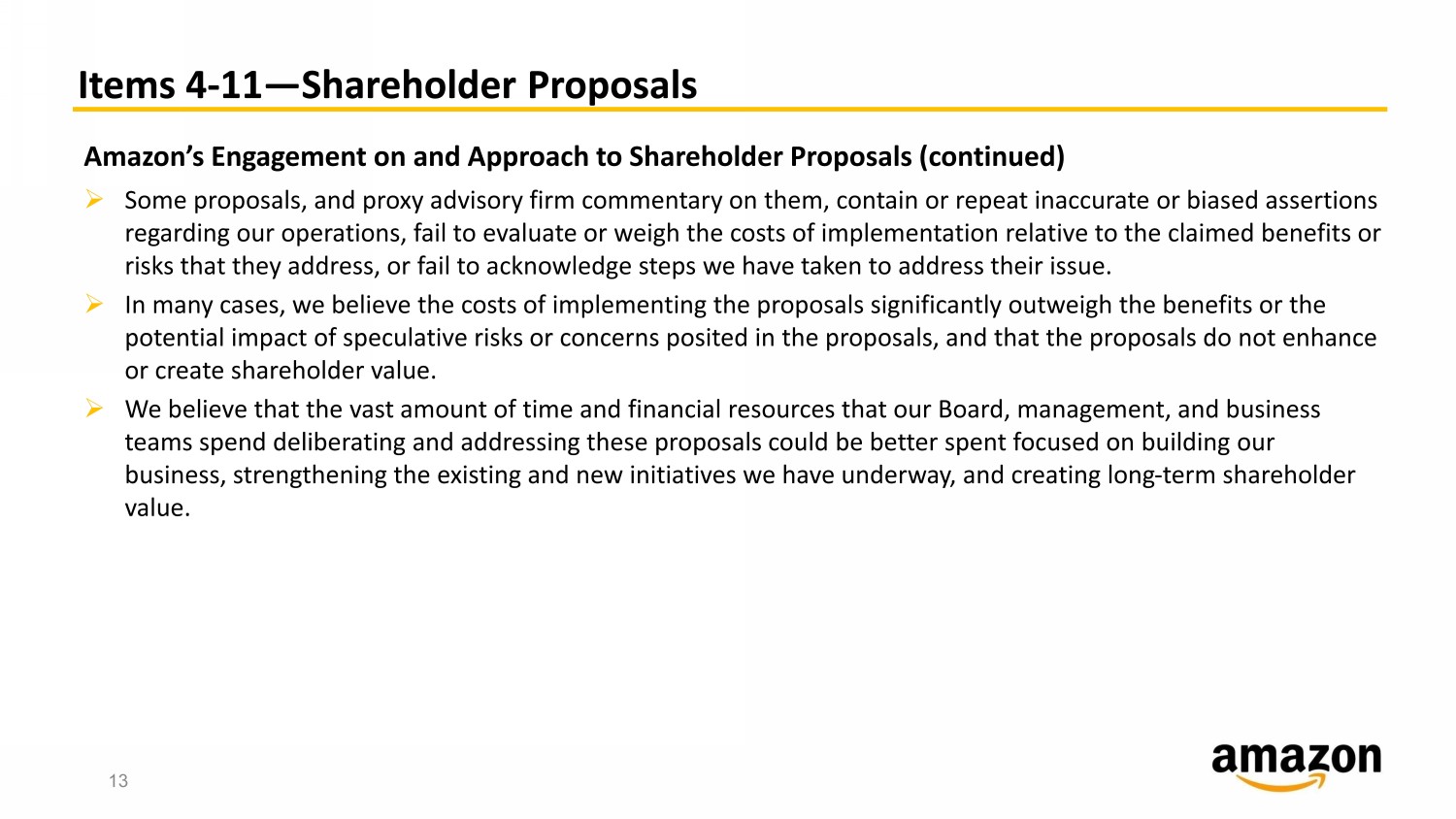Items 4 - 11 — Shareholder Proposals 12 Amazon’s Engagement on and Approach to Shareholder Proposals » Of the 8 shareholder proposals included in this year’s proxy statement: » Seven seek some form of report and two seek an independent, third - party assessment or study » Four are repeat proposals that failed in prior years » We have engaged directly with most shareholder proponents, before and/or after they have submitted a proposal, and carefully evaluate each proposal to assess the extent to which we already address the requested action. » We may choose not to engage with proponents and their representatives when past interactions have demonstrated that further engagement is unlikely to be constructive. » When a proposal aligns with our existing principles, goals, and priorities, would be in the best interests of the Company, and would generate long - term shareholder value, we may implement the proposal, although in a manner that differs from what the proposal requests. » We oppose proposals when they do not take into account the actions we already are taking or have taken that we believe resolve or mitigate the underlying concerns of the proposal, the decisions we have made in prioritizing our initiatives, or the unique and evolving nature of our operations.