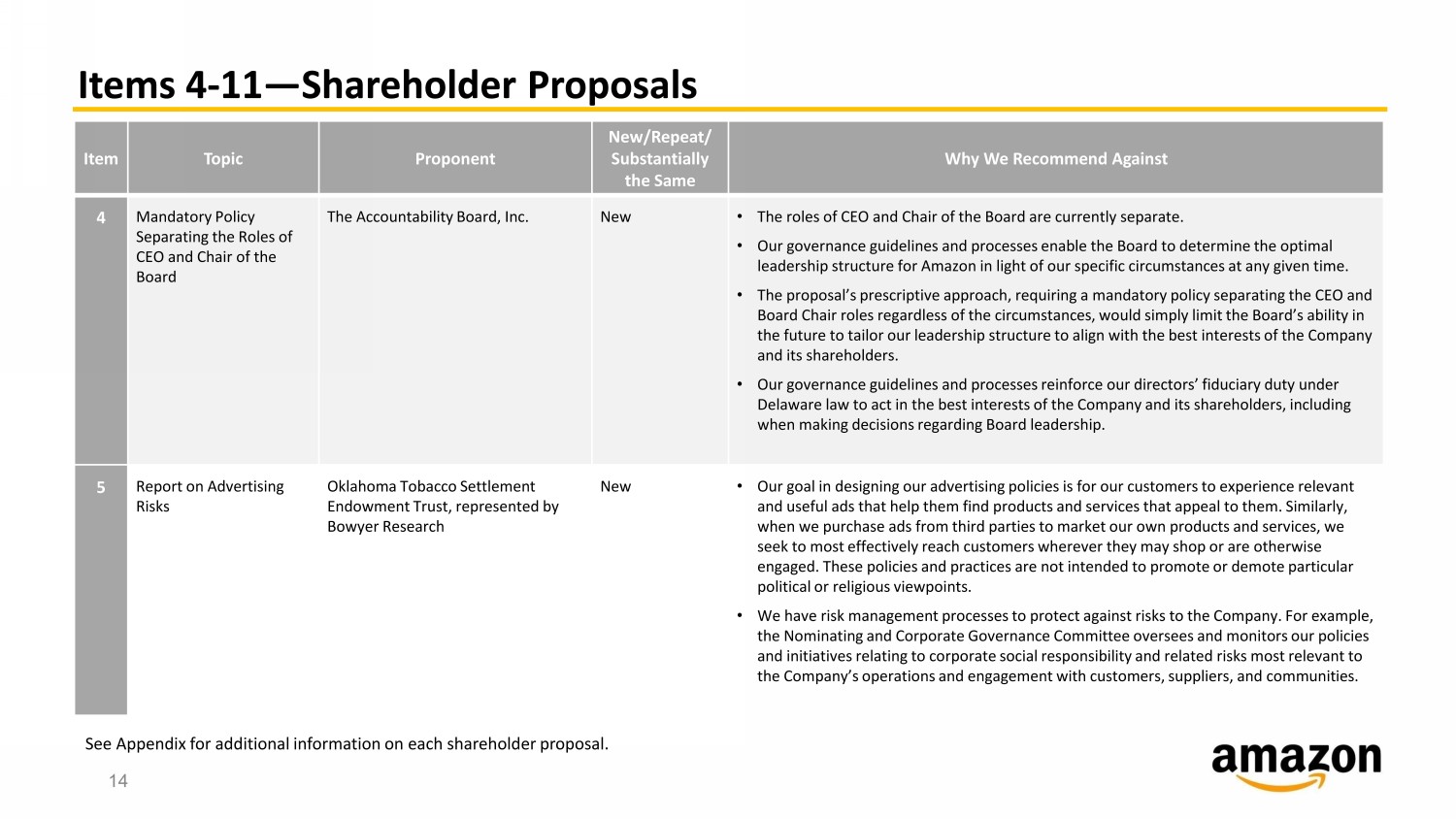 14 Why We Recommend Against New/Repeat/ Substantially the Same Proponent Topic Item • The roles of CEO and Chair of the Board are currently separate. • Our governance guidelines and processes enable the Board to determine the optimal leadership structure for Amazon in light of our specific circumstances at any given time. • The proposal’s prescriptive approach, requiring a mandatory policy separating the CEO and Board Chair roles regardless of the circumstances, would simply limit the Board’s ability in the future to tailor our leadership structure to align with the best interests of the Company and its shareholders. • Our governance guidelines and processes reinforce our directors’ fiduciary duty under Delaware law to act in the best interests of the Company and its shareholders, including when making decisions regarding Board leadership. New The Accountability Board, Inc. Mandatory Policy Separating the Roles of CEO and Chair of the Board 4 • Our goal in designing our advertising policies is for our customers to experience relevant and useful ads that help them find products and services that appeal to them. Similarly, when we purchase ads from third parties to market our own products and services, we seek to most effectively reach customers wherever they may shop or are otherwise engaged. These policies and practices are not intended to promote or demote particular political or religious viewpoints. • We have risk management processes to protect against risks to the Company. For example, the Nominating and Corporate Governance Committee oversees and monitors our policies and initiatives relating to corporate social responsibility and related risks most relevant to the Company’s operations and engagement with customers, suppliers, and communities. New Oklahoma Tobacco Settlement Endowment Trust, represented by Bowyer Research Report on Advertising Risks 5 See Appendix for additional information on each shareholder proposal. Items 4 - 11 — Shareholder Proposals
