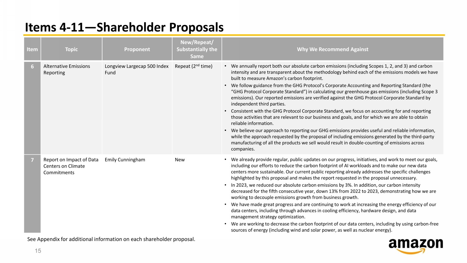 15 Why We Recommend Against New/Repeat/ Substantially the Same Proponent Topic Item • We annually report both our absolute carbon emissions (including Scopes 1, 2, and 3) and carbon intensity and are transparent about the methodology behind each of the emissions models we have built to measure Amazon’s carbon footprint. • We follow guidance from the GHG Protocol’s Corporate Accounting and Reporting Standard (the “GHG Protocol Corporate Standard”) in calculating our greenhouse gas emissions (including Scope 3 emissions). Our reported emissions are verified against the GHG Protocol Corporate Standard by independent third parties. • Consistent with the GHG Protocol Corporate Standard, we focus on accounting for and reporting those activities that are relevant to our business and goals, and for which we are able to obtain reliable information. • We believe our approach to reporting our GHG emissions provides useful and reliable information, while the approach requested by the proposal of including emissions generated by the third - party manufacturing of all the products we sell would result in double - counting of emissions across companies. Repeat (2 nd time) Longview Largecap 500 Index Fund Alternative Emissions Reporting 6 • We already provide regular, public updates on our progress, initiatives, and work to meet our goals, including our efforts to reduce the carbon footprint of AI workloads and to make our new data centers more sustainable. Our current public reporting already addresses the specific challenges highlighted by this proposal and makes the report requested in the proposal unnecessary. • In 2023, we reduced our absolute carbon emissions by 3%. In addition, our carbon intensity decreased for the fifth consecutive year, down 13% from 2022 to 2023, demonstrating how we are working to decouple emissions growth from business growth. • We have made great progress and are continuing to work at increasing the energy efficiency of our data centers, including through advances in cooling efficiency, hardware design, and data management strategy optimization. • We are working to decrease the carbon footprint of our data centers, including by using carbon - free sources of energy (including wind and solar power, as well as nuclear energy). New Emily Cunningham Report on Impact of Data Centers on Climate Commitments 7 See Appendix for additional information on each shareholder proposal. Items 4 - 11 — Shareholder Proposals