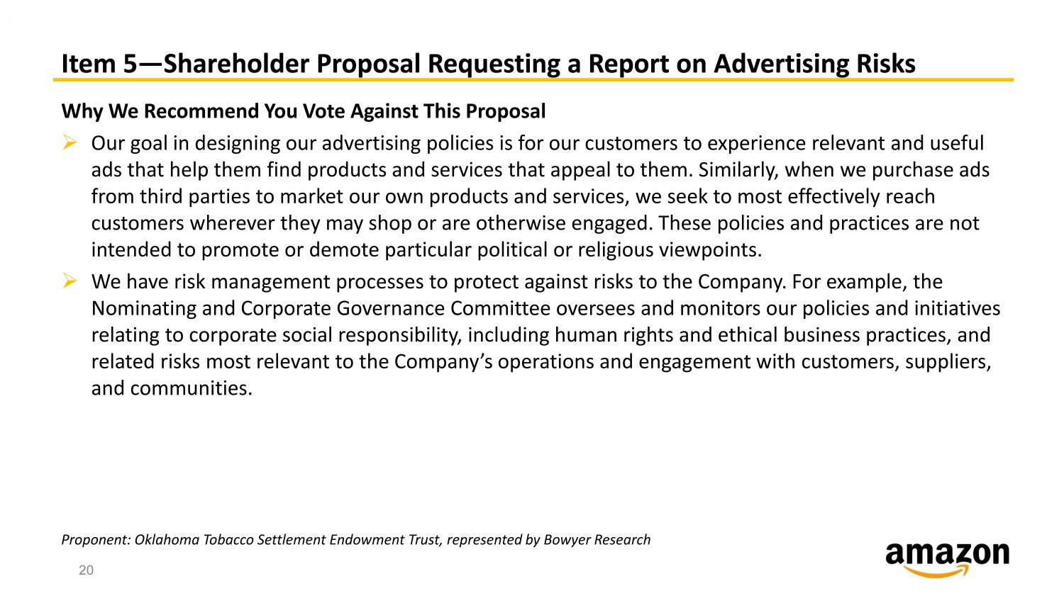 Item 5 — Shareholder Proposal Requesting a Report on Advertising Risks Why We Recommend You Vote Against This Proposal » Our goal in designing our advertising policies is for our customers to experience relevant and useful ads that help them find products and services that appeal to them. Similarly, when we purchase ads from third parties to market our own products and services, we seek to most effectively reach customers wherever they may shop or are otherwise engaged. These policies and practices are not intended to promote or demote particular political or religious viewpoints. » We have risk management processes to protect against risks to the Company. For example, the Nominating and Corporate Governance Committee oversees and monitors our policies and initiatives relating to corporate social responsibility, including human rights and ethical business practices, and related risks most relevant to the Company’s operations and engagement with customers, suppliers, and communities. 20 Proponent: Oklahoma Tobacco Settlement Endowment Trust, represented by Bowyer Research