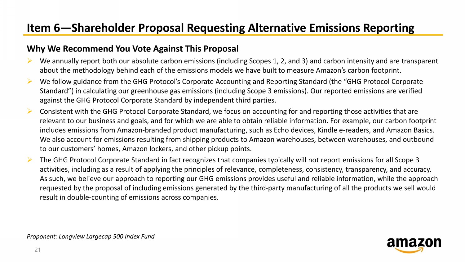 Item 6 — Shareholder Proposal Requesting Alternative Emissions Reporting Why We Recommend You Vote Against This Proposal » We annually report both our absolute carbon emissions (including Scopes 1, 2, and 3) and carbon intensity and are transparent about the methodology behind each of the emissions models we have built to measure Amazon’s carbon footprint. » We follow guidance from the GHG Protocol’s Corporate Accounting and Reporting Standard (the “GHG Protocol Corporate Standard”) in calculating our greenhouse gas emissions (including Scope 3 emissions). Our reported emissions are verified against the GHG Protocol Corporate Standard by independent third parties. » Consistent with the GHG Protocol Corporate Standard, we focus on accounting for and reporting those activities that are relevant to our business and goals, and for which we are able to obtain reliable information. For example, our carbon footpri nt includes emissions from Amazon - branded product manufacturing, such as Echo devices, Kindle e - readers, and Amazon Basics. We also account for emissions resulting from shipping products to Amazon warehouses, between warehouses, and outbound to our customers’ homes, Amazon lockers, and other pickup points. » The GHG Protocol Corporate Standard in fact recognizes that companies typically will not report emissions for all Scope 3 activities, including as a result of applying the principles of relevance, completeness, consistency, transparency, and accur acy . As such, we believe our approach to reporting our GHG emissions provides useful and reliable information, while the approach requested by the proposal of including emissions generated by the third - party manufacturing of all the products we sell would result in double - counting of emissions across companies. 21 Proponent: Longview Largecap 500 Index Fund