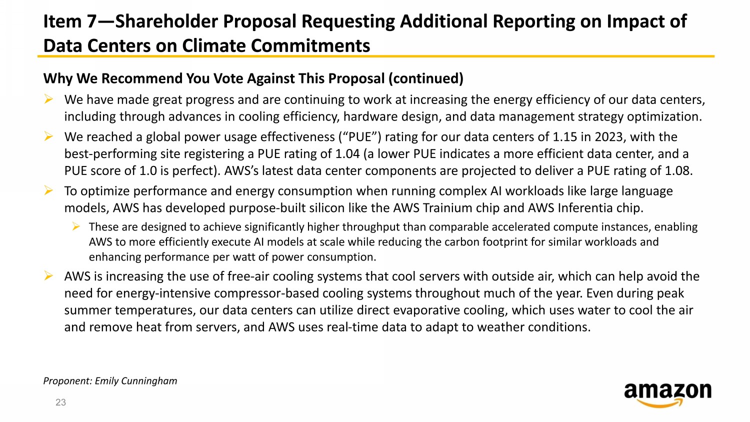 Item 7 — Shareholder Proposal Requesting Additional Reporting on Impact of Data Centers on Climate Commitments Why We Recommend You Vote Against This Proposal (continued) » We have made great progress and are continuing to work at increasing the energy efficiency of our data centers, including through advances in cooling efficiency, hardware design, and data management strategy optimization. » We reached a global power usage effectiveness (“PUE”) rating for our data centers of 1.15 in 2023, with the best - performing site registering a PUE rating of 1.04 (a lower PUE indicates a more efficient data center, and a PUE score of 1.0 is perfect). AWS’s latest data center components are projected to deliver a PUE rating of 1.08. » To optimize performance and energy consumption when running complex AI workloads like large language models, AWS has developed purpose - built silicon like the AWS Trainium chip and AWS Inferentia chip. » These are designed to achieve significantly higher throughput than comparable accelerated compute instances, enabling AWS to more efficiently execute AI models at scale while reducing the carbon footprint for similar workloads and enhancing performance per watt of power consumption. » AWS is increasing the use of free - air cooling systems that cool servers with outside air, which can help avoid the need for energy - intensive compressor - based cooling systems throughout much of the year. Even during peak summer temperatures, our data centers can utilize direct evaporative cooling, which uses water to cool the air and remove heat from servers, and AWS uses real - time data to adapt to weather conditions. 23 Proponent: Emily Cunningham