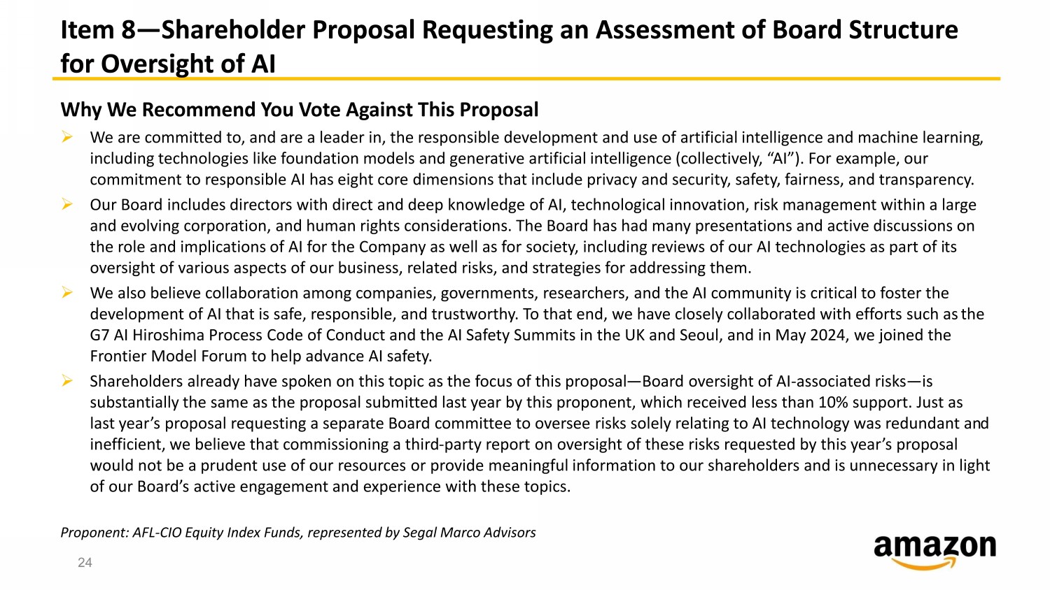 Item 8 — Shareholder Proposal Requesting an Assessment of Board Structure for Oversight of AI Why We Recommend You Vote Against This Proposal » We are committed to, and are a leader in, the responsible development and use of artificial intelligence and machine learning , including technologies like foundation models and generative artificial intelligence (collectively, “AI”). For example, our commitment to responsible AI has eight core dimensions that include privacy and security, safety, fairness, and transparency. » Our Board includes directors with direct and deep knowledge of AI, technological innovation, risk management within a large and evolving corporation, and human rights considerations. The Board has had many presentations and active discussions on the role and implications of AI for the Company as well as for society, including reviews of our AI technologies as part of i ts oversight of various aspects of our business, related risks, and strategies for addressing them. » We also believe collaboration among companies, governments, researchers, and the AI community is critical to foster the development of AI that is safe, responsible, and trustworthy. To that end, we have closely collaborated with efforts such as the G7 AI Hiroshima Process Code of Conduct and the AI Safety Summits in the UK and Seoul, and in May 2024, we joined the Frontier Model Forum to help advance AI safety. » Shareholders already have spoken on this topic as the focus of this proposal — Board oversight of AI - associated risks — is substantially the same as the proposal submitted last year by this proponent, which received less than 10% support. Just as last year’s proposal requesting a separate Board committee to oversee risks solely relating to AI technology was redundant an d inefficient, we believe that commissioning a third - party report on oversight of these risks requested by this year’s proposal would not be a prudent use of our resources or provide meaningful information to our shareholders and is unnecessary in light of our Board’s active engagement and experience with these topics. 24 Proponent: AFL - CIO Equity Index Funds, represented by Segal Marco Advisors