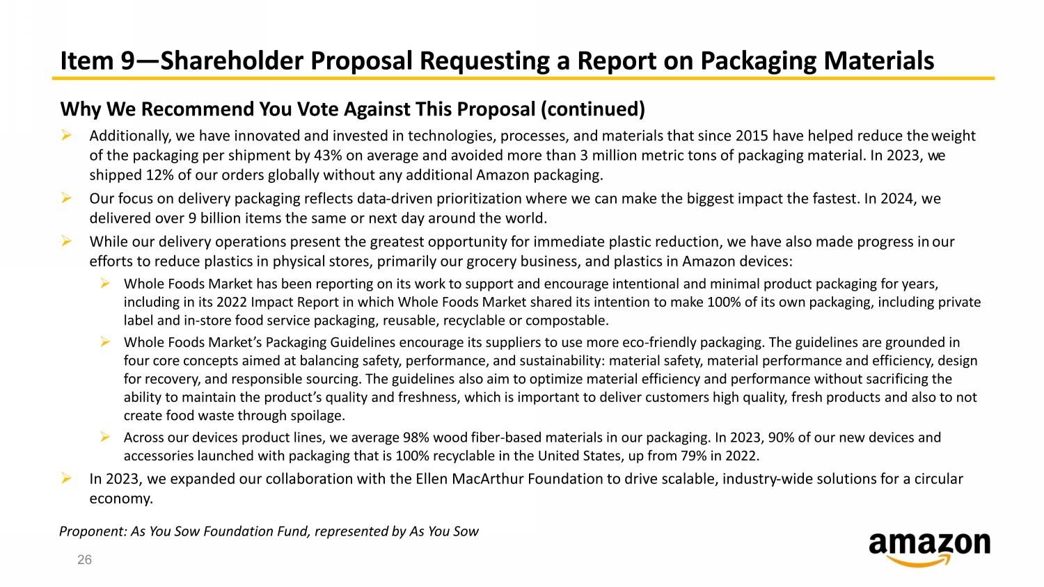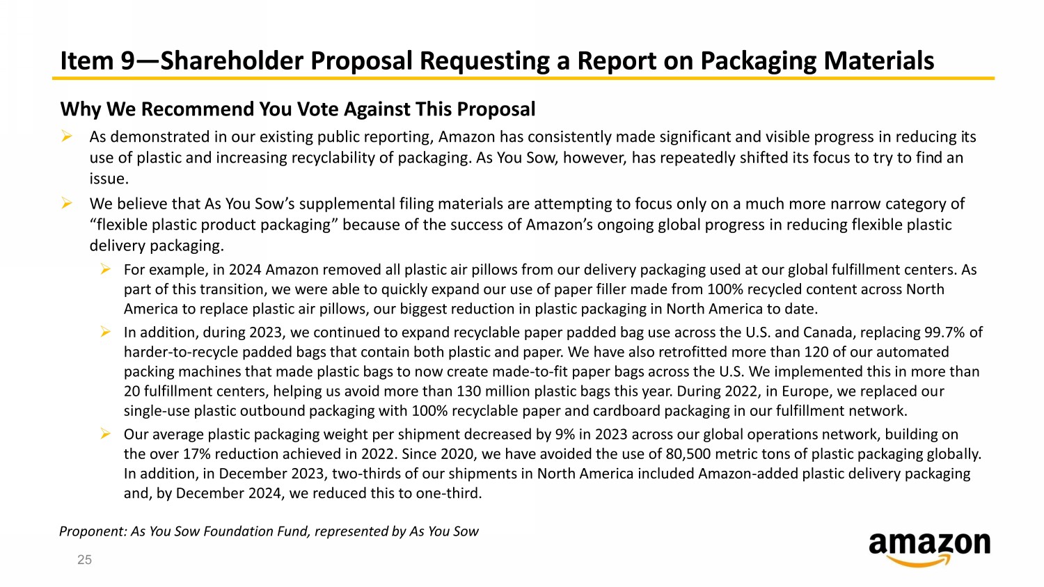 Item 9 — Shareholder Proposal Requesting a Report on Packaging Materials Why We Recommend You Vote Against This Proposal » As demonstrated in our existing public reporting, Amazon has consistently made significant and visible progress in reducing i ts use of plastic and increasing recyclability of packaging. As You Sow, however, has repeatedly shifted its focus to try to fin d a n issue. » We believe that As You Sow’s supplemental filing materials are attempting to focus only on a much more narrow category of “flexible plastic product packaging” because of the success of Amazon’s ongoing global progress in reducing flexible plastic delivery packaging. » For example, in 2024 Amazon removed all plastic air pillows from our delivery packaging used at our global fulfillment center s. As part of this transition, we were able to quickly expand our use of paper filler made from 100% recycled content across North America to replace plastic air pillows, our biggest reduction in plastic packaging in North America to date. » In addition, during 2023, we continued to expand recyclable paper padded bag use across the U.S. and Canada, replacing 99.7% of harder - to - recycle padded bags that contain both plastic and paper. We have also retrofitted more than 120 of our automated packing machines that made plastic bags to now create made - to - fit paper bags across the U.S. We implemented this in more than 20 fulfillment centers, helping us avoid more than 130 million plastic bags this year. During 2022, in Europe, we replaced ou r single - use plastic outbound packaging with 100% recyclable paper and cardboard packaging in our fulfillment network. » Our average plastic packaging weight per shipment decreased by 9% in 2023 across our global operations network, building on the over 17% reduction achieved in 2022. Since 2020, we have avoided the use of 80,500 metric tons of plastic packaging globa lly . In addition, in December 2023, two - thirds of our shipments in North America included Amazon - added plastic delivery packaging and, by December 2024, we reduced this to one - third. 25 Proponent: As You Sow Foundation Fund, represented by As You Sow