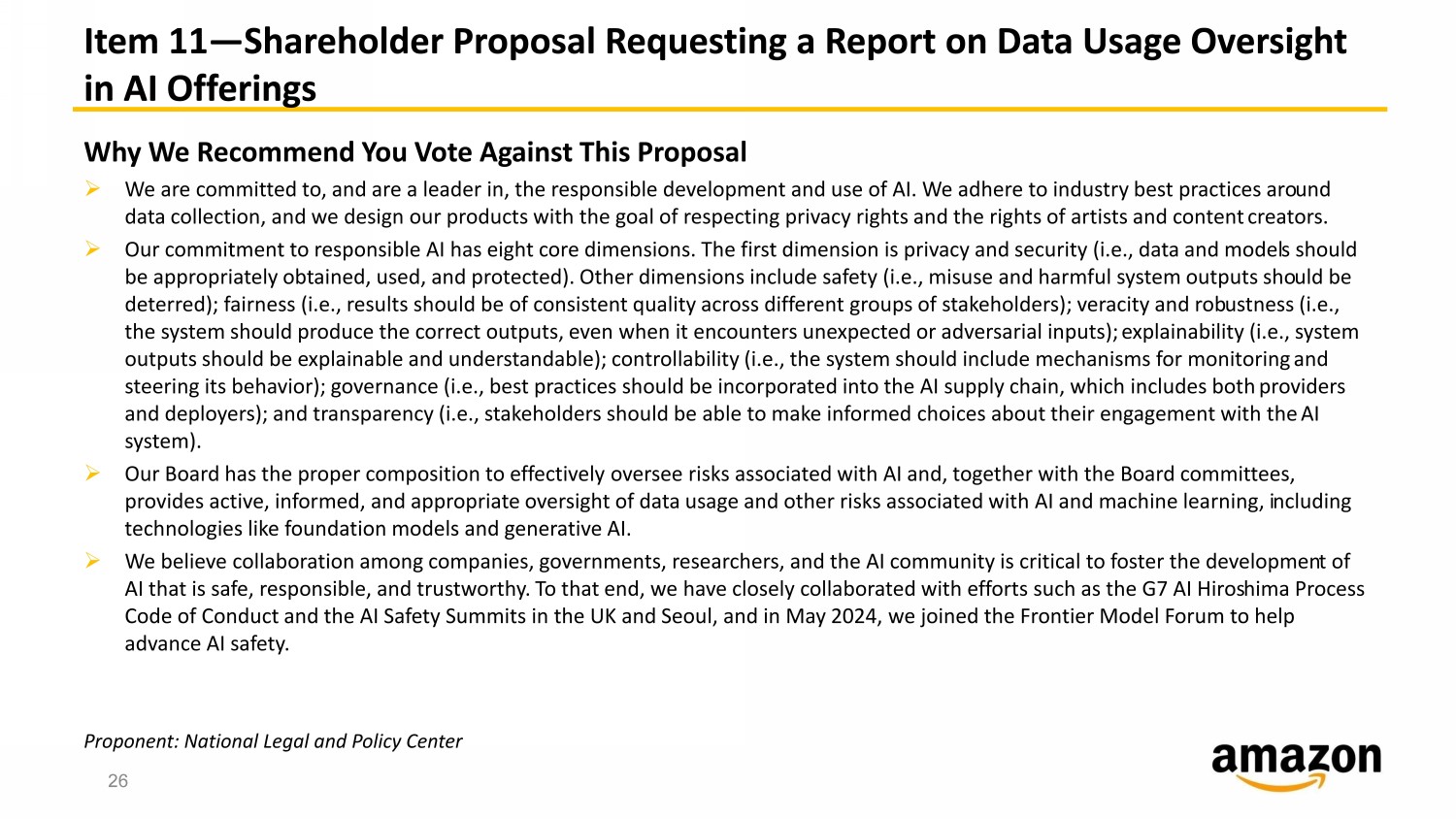 Item 11 — Shareholder Proposal Requesting a Report on Data Usage Oversight in AI Offerings Why We Recommend You Vote Against This Proposal » We are committed to, and are a leader in, the responsible development and use of AI. We adhere to industry best practices aro und data collection, and we design our products with the goal of respecting privacy rights and the rights of artists and content cre ators. » Our commitment to responsible AI has eight core dimensions. The first dimension is privacy and security (i.e., data and model s s hould be appropriately obtained, used, and protected). Other dimensions include safety (i.e., misuse and harmful system outputs sho uld be deterred); fairness (i.e., results should be of consistent quality across different groups of stakeholders); veracity and rob ust ness (i.e., the system should produce the correct outputs, even when it encounters unexpected or adversarial inputs); explainability (i.e., system outputs should be explainable and understandable); controllability (i.e., the system should include mechanisms for monitoring an d steering its behavior); governance (i.e., best practices should be incorporated into the AI supply chain, which includes both pr oviders and deployers); and transparency (i.e., stakeholders should be able to make informed choices about their engagement with the AI system). » Our Board has the proper composition to effectively oversee risks associated with AI and, together with the Board committees, provides active, informed, and appropriate oversight of data usage and other risks associated with AI and machine learning, i ncl uding technologies like foundation models and generative AI. » We believe collaboration among companies, governments, researchers, and the AI community is critical to foster the developmen t o f AI that is safe, responsible, and trustworthy. To that end, we have closely collaborated with efforts such as the G7 AI Hiros him a Process Code of Conduct and the AI Safety Summits in the UK and Seoul, and in May 2024, we joined the Frontier Model Forum to help advance AI safety. 26 Proponent: National Legal and Policy Center