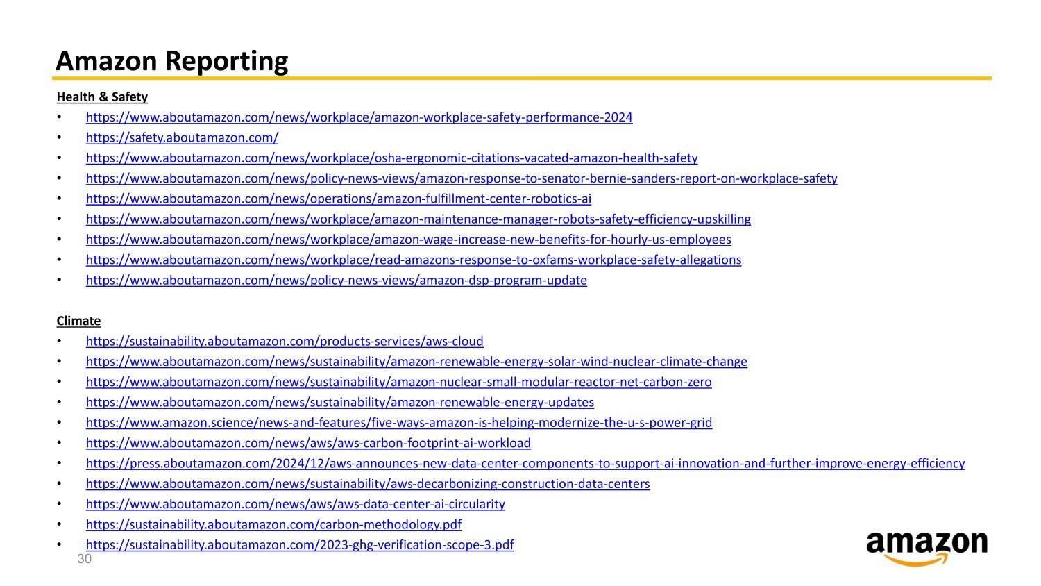Amazon Reporting 30 Health & Safety • https://www.aboutamazon.com/news/workplace/amazon - workplace - safety - performance - 2024 • https://safety.aboutamazon.com/ • https://www.aboutamazon.com/news/workplace/osha - ergonomic - citations - vacated - amazon - health - safety • https://www.aboutamazon.com/news/policy - news - views/amazon - response - to - senator - bernie - sanders - report - on - workplace - safety • https://www.aboutamazon.com/news/operations/amazon - fulfillment - center - robotics - ai • https://www.aboutamazon.com/news/workplace/amazon - maintenance - manager - robots - safety - efficiency - upskilling • https://www.aboutamazon.com/news/workplace/amazon - wage - increase - new - benefits - for - hourly - us - employees • https://www.aboutamazon.com/news/workplace/read - amazons - response - to - oxfams - workplace - safety - allegations • https://www.aboutamazon.com/news/policy - news - views/amazon - dsp - program - update Climate • https://sustainability.aboutamazon.com/products - services/aws - cloud • https://www.aboutamazon.com/news/sustainability/amazon - renewable - energy - solar - wind - nuclear - climate - change • https://www.aboutamazon.com/news/sustainability/amazon - nuclear - small - modular - reactor - net - carbon - zero • https://www.aboutamazon.com/news/sustainability/amazon - renewable - energy - updates • https://www.amazon.science/news - and - features/five - ways - amazon - is - helping - modernize - the - u - s - power - grid • https://www.aboutamazon.com/news/aws/aws - carbon - footprint - ai - workload • https://press.aboutamazon.com/2024/12/aws - announces - new - data - center - components - to - support - ai - innovation - and - further - improve - ener gy - efficiency • https://www.aboutamazon.com/news/sustainability/aws - decarbonizing - construction - data - centers • https://www.aboutamazon.com/news/aws/aws - data - center - ai - circularity • https://sustainability.aboutamazon.com/carbon - methodology.pdf • https://sustainability.aboutamazon.com/2023 - ghg - verification - scope - 3.pdf