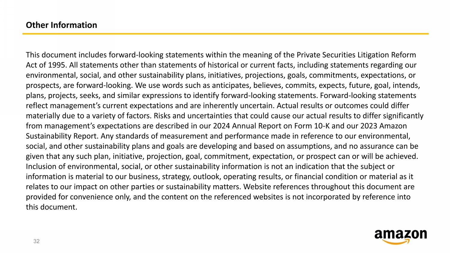 This document includes forward - looking statements within the meaning of the Private Securities Litigation Reform Act of 1995. All statements other than statements of historical or current facts, including statements regarding our environmental, social, and other sustainability plans, initiatives, projections, goals, commitments, expectations, or prospects, are forward - looking. We use words such as anticipates, believes, commits, expects, future, goal, intends, plans, projects, seeks, and similar expressions to identify forward - looking statements. Forward - looking statements reflect management’s current expectations and are inherently uncertain. Actual results or outcomes could differ materially due to a variety of factors. Risks and uncertainties that could cause our actual results to differ significantly from management’s expectations are described in our 2024 Annual Report on Form 10 - K and our 2023 Amazon Sustainability Report. Any standards of measurement and performance made in reference to our environmental, social, and other sustainability plans and goals are developing and based on assumptions, and no assurance can be given that any such plan, initiative, projection, goal, commitment, expectation, or prospect can or will be achieved. Inclusion of environmental, social, or other sustainability information is not an indication that the subject or information is material to our business, strategy, outlook, operating results, or financial condition or material as it relates to our impact on other parties or sustainability matters. Website references throughout this document are provided for convenience only, and the content on the referenced websites is not incorporated by reference into this document. 32 Other Information