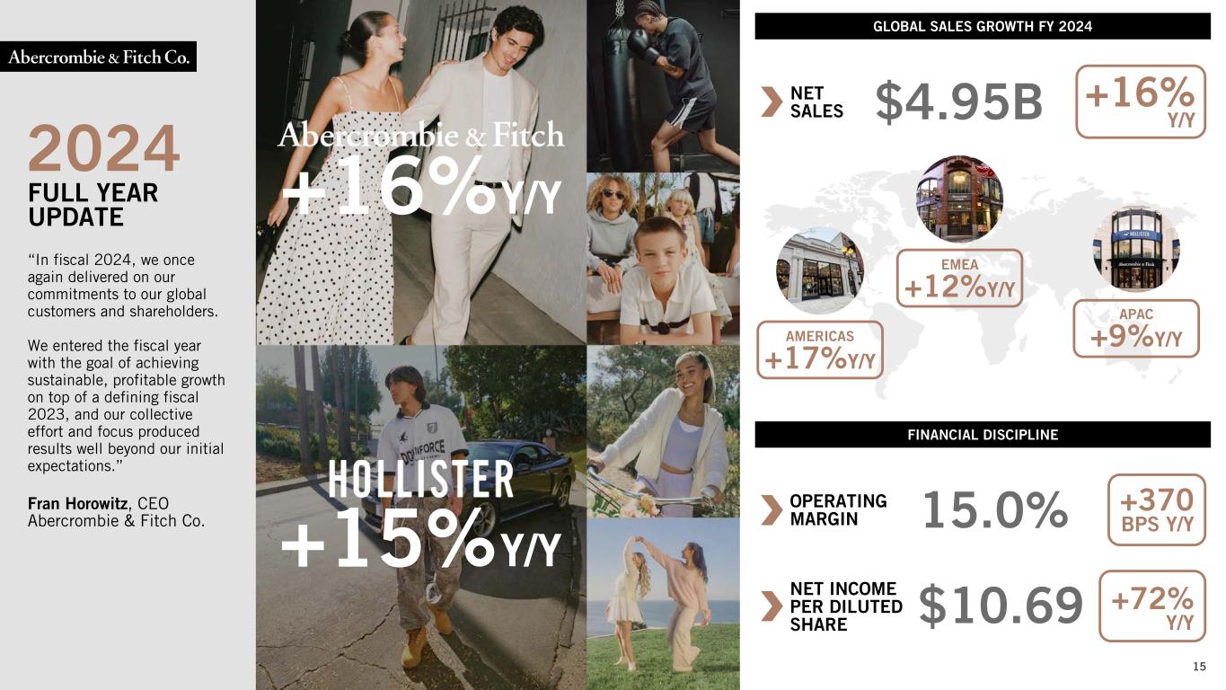 15.0%+15%Y/Y +16%Y/Y OPERATING MARGIN $10.69 “In fiscal 2024, we once again delivered on our commitments to our global customers and shareholders. We entered the fiscal year with the goal of achieving sustainable, profitable growth on top of a defining fiscal 2023, and our collective effort and focus produced results well beyond our initial expectations.” Fran Horowitz, CEO Abercrombie & Fitch Co. 15 2024 +16% Y/Y NET INCOME PER DILUTED SHARE NET SALES GLOBAL SALES GROWTH FY 2024 FINANCIAL DISCIPLINE +72% Y/Y +370 BPS Y/Y AMERICAS +17%Y/Y EMEA +12%Y/Y FULL YEAR UPDATE APAC +9%Y/Y $4.95B
