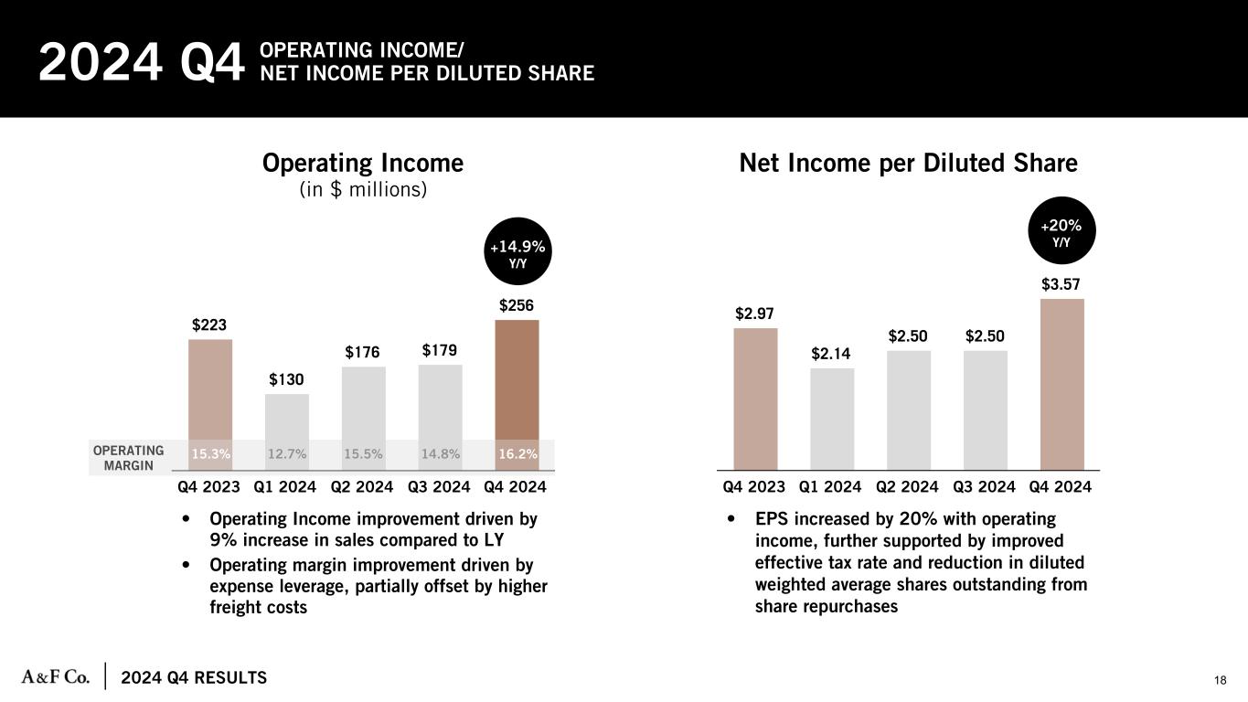 APPENDIX (1) The estimated impact from foreign currency is determined by applying current period exchange rates to prior year results and is net of the year-over-year impact from hedging. The per diluted share estimated impact from foreign currency is calculated using a 26% tax rate. (2) Net sales by segment are presented by attributing revenues to a physical store location or geographical region that fulfills the order. (in thousands) Q4 2024 Q4 2023 GAAP Δ % NON-GAAP CONSTANT CURRENCY BASIS Δ %GAAP IMPACT FROM CHANGES IN FOREIGN CURRENCY EXCHANGE RATES (1) NON-GAAP CONSTANT CURRENCY BASIS NET SALES BY REGION: (2) AMERICAS $ 1,319,720 $ 1,191,259 $ (2,358) $ 1,188,901 11% 11% EMEA 224,467 219,050 (3,066) 215,984 2% 4% APAC 40,730 42,598 (714) 41,884 (4)% (3)% TOTAL COMPANY $ 1,584,917 $ 1,452,907 $ (6,138) $ 1,446,769 9% 10% (in thousands) Q4 2024 Q4 2023 GAAP Δ % NON-GAAP CONSTANT CURRENCY BASIS Δ % GAAP IMPACT FROM CHANGES IN FOREIGN CURRENCY EXCHANGE RATES (1) NON-GAAP CONSTANT CURRENCY BASIS NET SALES BY BRAND: ABERCROMBIE 772,670 755,203 (2,370) 752,833 2% 3% HOLLISTER $ 812,247 $ 697,704 $ (3,768) $ 693,936 16% 17% TOTAL COMPANY $ 1,584,917 $ 1,452,907 $ (6,138) $ 1,446,769 9% 10% Q4 RECONCILIATION OF GAAP TO NON-GAAP RESULTS NET SALES BY BRAND AND GEOGRAPHY 29