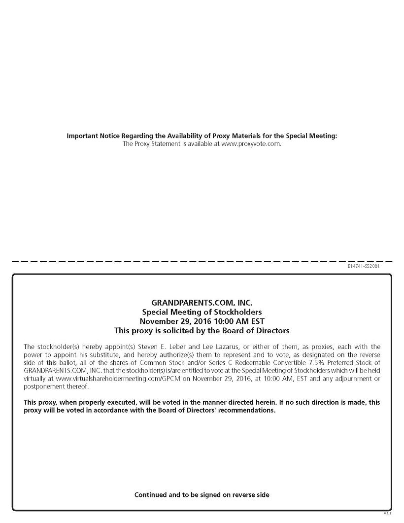 The Board of Directors of Grandparents.com, Inc. is soliciting your proxy to vote at the virtual special meeting of stockholders to be held on Tuesday, November 29, 2016, at 10:00 A.M. Eastern Time, and any adjournments or postponements of the meeting, which we refer to as the virtual special meeting. The proxy statement along with the accompanying Notice of Virtual Special Meeting of Stockholders summarizes the purposes of the meeting and the information you need to know to vote at the virtual special meeting.