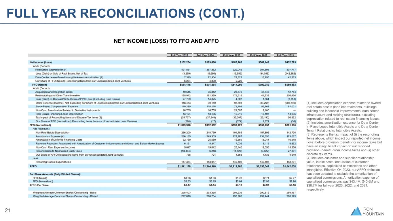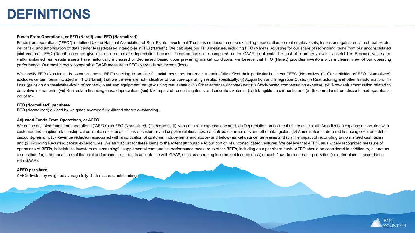 Funds From Operations, or FFO (Nareit), and FFO (Normalized) Funds from operations ("FFO") is defined by the National Association of Real Estate Investment Trusts as net income (loss) excluding depreciation on real estate assets, losses and gains on sale of real estate, net of tax, and amortization of data center leased-based intangibles (“FFO (Nareit)”). We calculate our FFO measure, including FFO (Nareit), adjusting for our share of reconciling items from our unconsolidated joint ventures. FFO (Nareit) does not give effect to real estate depreciation because these amounts are computed, under GAAP, to allocate the cost of a property over its useful life. Because values for well-maintained real estate assets have historically increased or decreased based upon prevailing market conditions, we believe that FFO (Nareit) provides investors with a clearer view of our operating performance. Our most directly comparable GAAP measure to FFO (Nareit) is net income (loss). We modify FFO (Nareit), as is common among REITs seeking to provide financial measures that most meaningfully reflect their particular business ("FFO (Normalized)"). Our definition of FFO (Normalized) excludes certain items included in FFO (Nareit) that we believe are not indicative of our core operating results, specifically: (i) Acquisition and Integration Costs; (ii) Restructuring and other transformation; (iii) Loss (gain) on disposal/write-down of property, plant and equipment, net (excluding real estate); (iv) Other expense (income) net; (v) Stock-based compensation expense; (vi) Non-cash amortization related to derivative instruments; (vii) Real estate financing lease depreciation; (viii) Tax impact of reconciling items and discrete tax items; (ix) Intangible impairments; and (x) (Income) loss from discontinued operations, net of tax. FFO (Normalized) per share FFO (Normalized) divided by weighted average fully-diluted shares outstanding. Adjusted Funds From Operations, or AFFO We define adjusted funds from operations (“AFFO”) as FFO (Normalized) (1) excluding (i) Non-cash rent expense (income), (ii) Depreciation on non-real estate assets, (iii) Amortization expense associated with customer and supplier relationship value, intake costs, acquisitions of customer and supplier relationships, capitalized commissions and other intangibles, (iv) Amortization of deferred financing costs and debt discount/premium, (v) Revenue reduction associated with amortization of customer inducements and above- and below-market data center leases and (vi) The impact of reconciling to normalized cash taxes and (2) including Recurring capital expenditures. We also adjust for these items to the extent attributable to our portion of unconsolidated ventures. We believe that AFFO, as a widely recognized measure of operations of REITs, is helpful to investors as a meaningful supplemental comparative performance measure to other REITs, including on a per share basis. AFFO should be considered in addition to, but not as a substitute for, other measures of financial performance reported in accordance with GAAP, such as operating income, net income (loss) or cash flows from operating activities (as determined in accordance with GAAP). AFFO per share AFFO divided by weighted average fully-diluted shares outstanding. DEFINITIONS