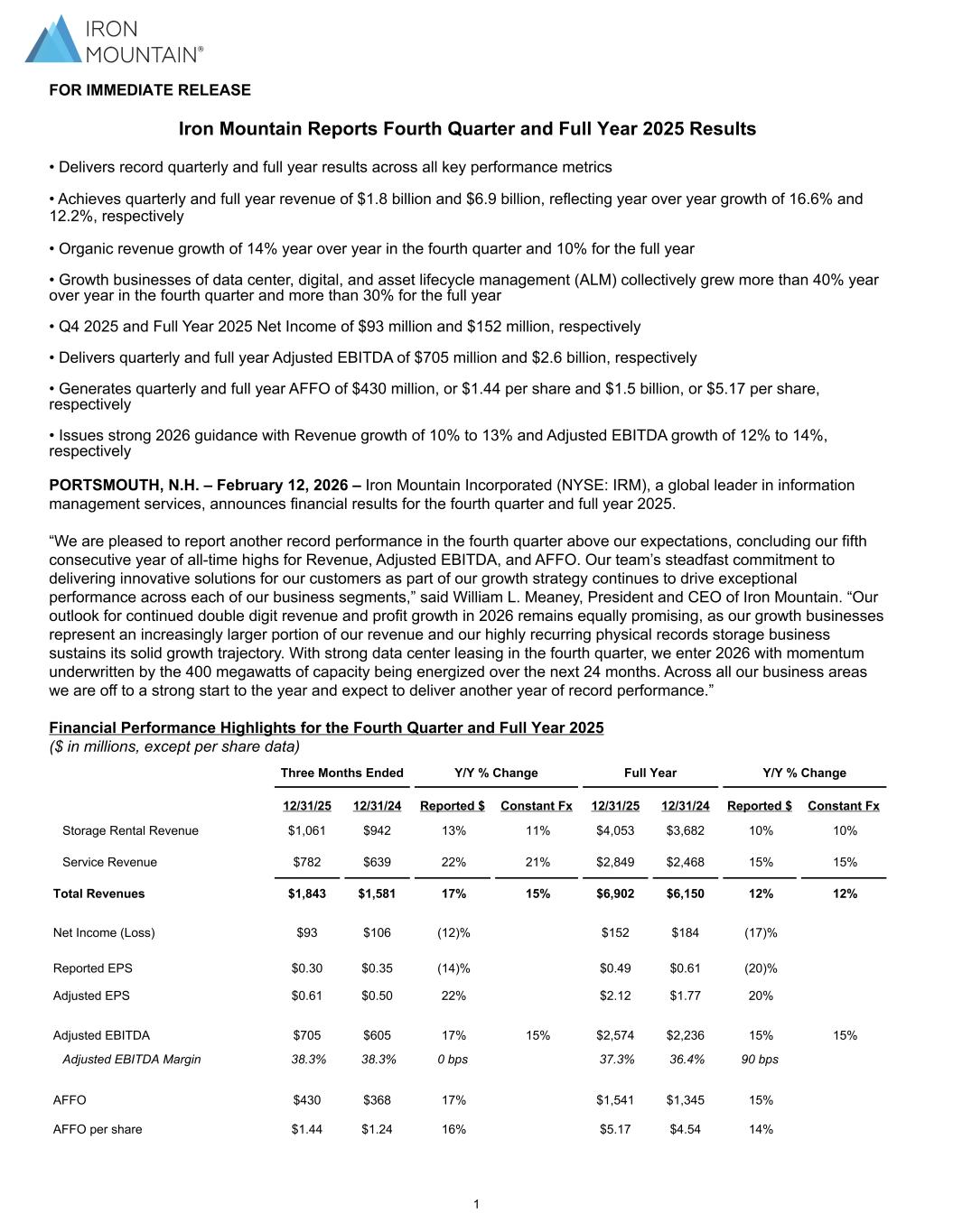 FOR IMMEDIATE RELEASE Iron Mountain Reports Fourth Quarter and Full Year 2025 Results • Delivers record quarterly and full year results across all key performance metrics • Achieves quarterly and full year revenue of $1.8 billion and $6.9 billion, reflecting year over year growth of 16.6% and 12.2%, respectively • Organic revenue growth of 14% year over year in the fourth quarter and 10% for the full year • Growth businesses of data center, digital, and asset lifecycle management (ALM) collectively grew more than 40% year over year in the fourth quarter and more than 30% for the full year • Q4 2025 and Full Year 2025 Net Income of $93 million and $152 million, respectively • Delivers quarterly and full year Adjusted EBITDA of $705 million and $2.6 billion, respectively • Generates quarterly and full year AFFO of $430 million, or $1.44 per share and $1.5 billion, or $5.17 per share, respectively • Issues strong 2026 guidance with Revenue growth of 10% to 13% and Adjusted EBITDA growth of 12% to 14%, respectively PORTSMOUTH, N.H. – February 12, 2026 – Iron Mountain Incorporated (NYSE: IRM), a global leader in information management services, announces financial results for the fourth quarter and full year 2025. “We are pleased to report another record performance in the fourth quarter above our expectations, concluding our fifth consecutive year of all-time highs for Revenue, Adjusted EBITDA, and AFFO. Our team’s steadfast commitment to delivering innovative solutions for our customers as part of our growth strategy continues to drive exceptional performance across each of our business segments,” said William L. Meaney, President and CEO of Iron Mountain. “Our outlook for continued double digit revenue and profit growth in 2026 remains equally promising, as our growth businesses represent an increasingly larger portion of our revenue and our highly recurring physical records storage business sustains its solid growth trajectory. With strong data center leasing in the fourth quarter, we enter 2026 with momentum underwritten by the 400 megawatts of capacity being energized over the next 24 months. Across all our business areas we are off to a strong start to the year and expect to deliver another year of record performance.” Financial Performance Highlights for the Fourth Quarter and Full Year 2025 ($ in millions, except per share data) Three Months Ended Y/Y % Change Full Year Y/Y % Change 12/31/25 12/31/24 Reported $ Constant Fx 12/31/25 12/31/24 Reported $ Constant Fx Storage Rental Revenue $1,061 $942 13% 11% $4,053 $3,682 10% 10% Service Revenue $782 $639 22% 21% $2,849 $2,468 15% 15% Total Revenues $1,843 $1,581 17% 15% $6,902 $6,150 12% 12% Net Income (Loss) $93 $106 (12)% $152 $184 (17)% Reported EPS $0.30 $0.35 (14)% $0.49 $0.61 (20)% Adjusted EPS $0.61 $0.50 22% $2.12 $1.77 20% Adjusted EBITDA $705 $605 17% 15% $2,574 $2,236 15% 15% Adjusted EBITDA Margin 38.3% 38.3% 0 bps 37.3% 36.4% 90 bps AFFO $430 $368 17% $1,541 $1,345 15% AFFO per share $1.44 $1.24 16% $5.17 $4.54 14% 1