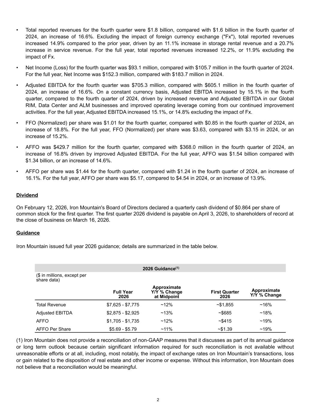 • Total reported revenues for the fourth quarter were $1.8 billion, compared with $1.6 billion in the fourth quarter of 2024, an increase of 16.6%. Excluding the impact of foreign currency exchange ("Fx"), total reported revenues increased 14.9% compared to the prior year, driven by an 11.1% increase in storage rental revenue and a 20.7% increase in service revenue. For the full year, total reported revenues increased 12.2%, or 11.9% excluding the impact of Fx. • Net Income (Loss) for the fourth quarter was $93.1 million, compared with $105.7 million in the fourth quarter of 2024. For the full year, Net Income was $152.3 million, compared with $183.7 million in 2024. • Adjusted EBITDA for the fourth quarter was $705.3 million, compared with $605.1 million in the fourth quarter of 2024, an increase of 16.6%. On a constant currency basis, Adjusted EBITDA increased by 15.1% in the fourth quarter, compared to the fourth quarter of 2024, driven by increased revenue and Adjusted EBITDA in our Global RIM, Data Center and ALM businesses and improved operating leverage coming from our continued improvement activities. For the full year, Adjusted EBITDA increased 15.1%, or 14.8% excluding the impact of Fx. • FFO (Normalized) per share was $1.01 for the fourth quarter, compared with $0.85 in the fourth quarter of 2024, an increase of 18.8%. For the full year, FFO (Normalized) per share was $3.63, compared with $3.15 in 2024, or an increase of 15.2%. • AFFO was $429.7 million for the fourth quarter, compared with $368.0 million in the fourth quarter of 2024, an increase of 16.8% driven by improved Adjusted EBITDA. For the full year, AFFO was $1.54 billion compared with $1.34 billion, or an increase of 14.6%. • AFFO per share was $1.44 for the fourth quarter, compared with $1.24 in the fourth quarter of 2024, an increase of 16.1%. For the full year, AFFO per share was $5.17, compared to $4.54 in 2024, or an increase of 13.9%. Dividend On February 12, 2026, Iron Mountain's Board of Directors declared a quarterly cash dividend of $0.864 per share of common stock for the first quarter. The first quarter 2026 dividend is payable on April 3, 2026, to shareholders of record at the close of business on March 16, 2026. Guidance Iron Mountain issued full year 2026 guidance; details are summarized in the table below. 2026 Guidance(1) ($ in millions, except per share data) Full Year 2026 Approximate Y/Y % Change at Midpoint First Quarter 2026 Approximate Y/Y % Change Total Revenue $7,625 - $7,775 ~12% ~$1,855 ~16% Adjusted EBITDA $2,875 - $2,925 ~13% ~$685 ~18% AFFO $1,705 - $1,735 ~12% ~$415 ~19% AFFO Per Share $5.69 - $5.79 ~11% ~$1.39 ~19% (1) Iron Mountain does not provide a reconciliation of non-GAAP measures that it discusses as part of its annual guidance or long term outlook because certain significant information required for such reconciliation is not available without unreasonable efforts or at all, including, most notably, the impact of exchange rates on Iron Mountain’s transactions, loss or gain related to the disposition of real estate and other income or expense. Without this information, Iron Mountain does not believe that a reconciliation would be meaningful. 2