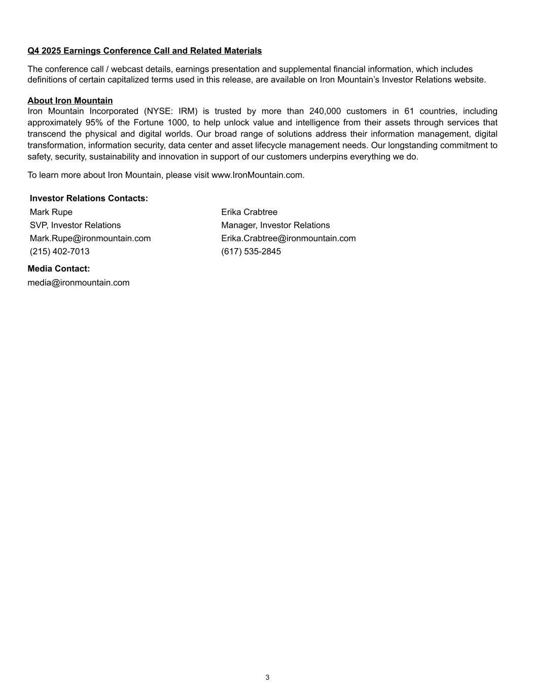 Q4 2025 Earnings Conference Call and Related Materials The conference call / webcast details, earnings presentation and supplemental financial information, which includes definitions of certain capitalized terms used in this release, are available on Iron Mountain’s Investor Relations website. About Iron Mountain Iron Mountain Incorporated (NYSE: IRM) is trusted by more than 240,000 customers in 61 countries, including approximately 95% of the Fortune 1000, to help unlock value and intelligence from their assets through services that transcend the physical and digital worlds. Our broad range of solutions address their information management, digital transformation, information security, data center and asset lifecycle management needs. Our longstanding commitment to safety, security, sustainability and innovation in support of our customers underpins everything we do. To learn more about Iron Mountain, please visit www.IronMountain.com. Investor Relations Contacts: Mark Rupe Erika Crabtree SVP, Investor Relations Manager, Investor Relations Mark.Rupe@ironmountain.com Erika.Crabtree@ironmountain.com (215) 402-7013 (617) 535-2845 Media Contact: media@ironmountain.com 3