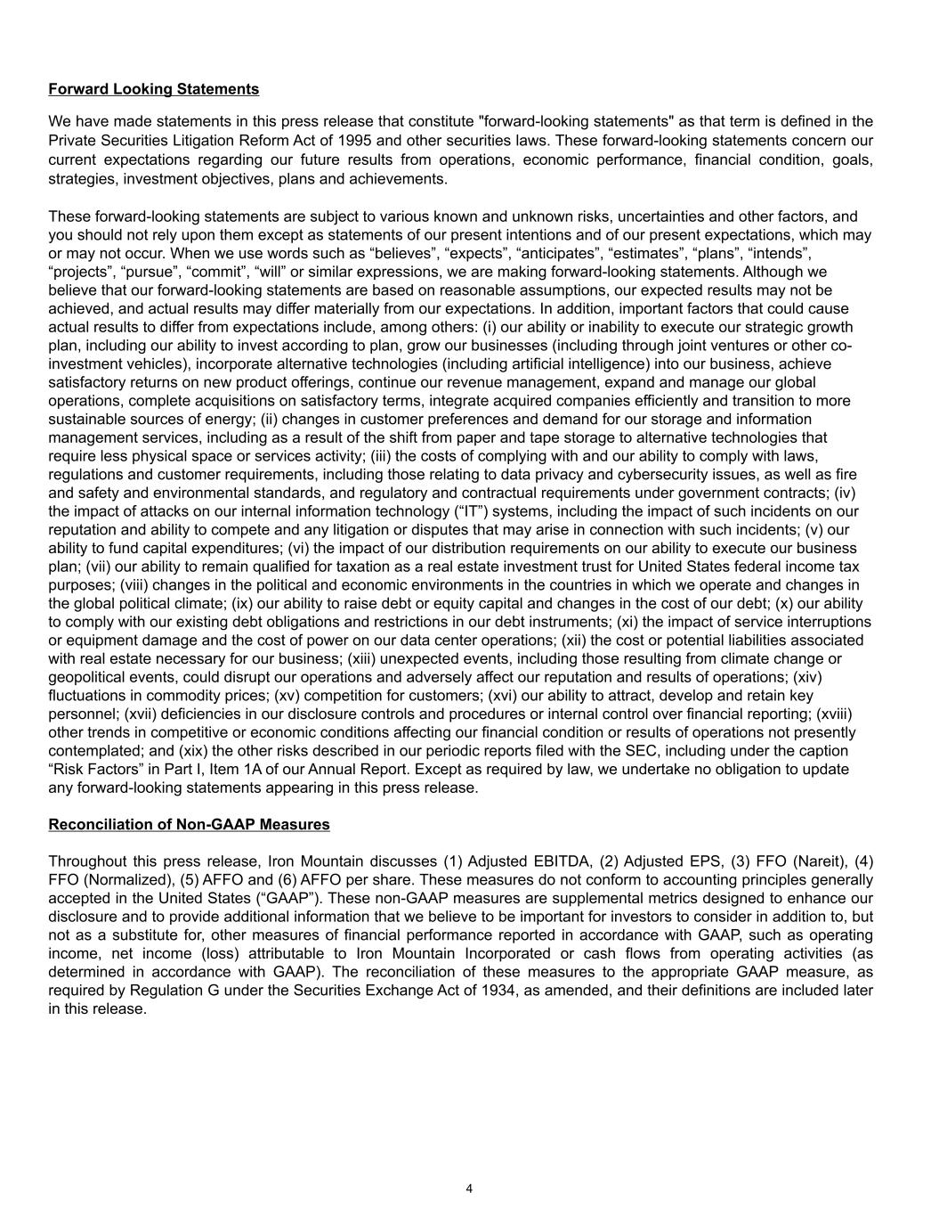 Forward Looking Statements We have made statements in this press release that constitute "forward-looking statements" as that term is defined in the Private Securities Litigation Reform Act of 1995 and other securities laws. These forward-looking statements concern our current expectations regarding our future results from operations, economic performance, financial condition, goals, strategies, investment objectives, plans and achievements. These forward-looking statements are subject to various known and unknown risks, uncertainties and other factors, and you should not rely upon them except as statements of our present intentions and of our present expectations, which may or may not occur. When we use words such as “believes”, “expects”, “anticipates”, “estimates”, “plans”, “intends”, “projects”, “pursue”, “commit”, “will” or similar expressions, we are making forward-looking statements. Although we believe that our forward-looking statements are based on reasonable assumptions, our expected results may not be achieved, and actual results may differ materially from our expectations. In addition, important factors that could cause actual results to differ from expectations include, among others: (i) our ability or inability to execute our strategic growth plan, including our ability to invest according to plan, grow our businesses (including through joint ventures or other co- investment vehicles), incorporate alternative technologies (including artificial intelligence) into our business, achieve satisfactory returns on new product offerings, continue our revenue management, expand and manage our global operations, complete acquisitions on satisfactory terms, integrate acquired companies efficiently and transition to more sustainable sources of energy; (ii) changes in customer preferences and demand for our storage and information management services, including as a result of the shift from paper and tape storage to alternative technologies that require less physical space or services activity; (iii) the costs of complying with and our ability to comply with laws, regulations and customer requirements, including those relating to data privacy and cybersecurity issues, as well as fire and safety and environmental standards, and regulatory and contractual requirements under government contracts; (iv) the impact of attacks on our internal information technology (“IT”) systems, including the impact of such incidents on our reputation and ability to compete and any litigation or disputes that may arise in connection with such incidents; (v) our ability to fund capital expenditures; (vi) the impact of our distribution requirements on our ability to execute our business plan; (vii) our ability to remain qualified for taxation as a real estate investment trust for United States federal income tax purposes; (viii) changes in the political and economic environments in the countries in which we operate and changes in the global political climate; (ix) our ability to raise debt or equity capital and changes in the cost of our debt; (x) our ability to comply with our existing debt obligations and restrictions in our debt instruments; (xi) the impact of service interruptions or equipment damage and the cost of power on our data center operations; (xii) the cost or potential liabilities associated with real estate necessary for our business; (xiii) unexpected events, including those resulting from climate change or geopolitical events, could disrupt our operations and adversely affect our reputation and results of operations; (xiv) fluctuations in commodity prices; (xv) competition for customers; (xvi) our ability to attract, develop and retain key personnel; (xvii) deficiencies in our disclosure controls and procedures or internal control over financial reporting; (xviii) other trends in competitive or economic conditions affecting our financial condition or results of operations not presently contemplated; and (xix) the other risks described in our periodic reports filed with the SEC, including under the caption “Risk Factors” in Part I, Item 1A of our Annual Report. Except as required by law, we undertake no obligation to update any forward-looking statements appearing in this press release. Reconciliation of Non-GAAP Measures Throughout this press release, Iron Mountain discusses (1) Adjusted EBITDA, (2) Adjusted EPS, (3) FFO (Nareit), (4) FFO (Normalized), (5) AFFO and (6) AFFO per share. These measures do not conform to accounting principles generally accepted in the United States (“GAAP”). These non-GAAP measures are supplemental metrics designed to enhance our disclosure and to provide additional information that we believe to be important for investors to consider in addition to, but not as a substitute for, other measures of financial performance reported in accordance with GAAP, such as operating income, net income (loss) attributable to Iron Mountain Incorporated or cash flows from operating activities (as determined in accordance with GAAP). The reconciliation of these measures to the appropriate GAAP measure, as required by Regulation G under the Securities Exchange Act of 1934, as amended, and their definitions are included later in this release. 4