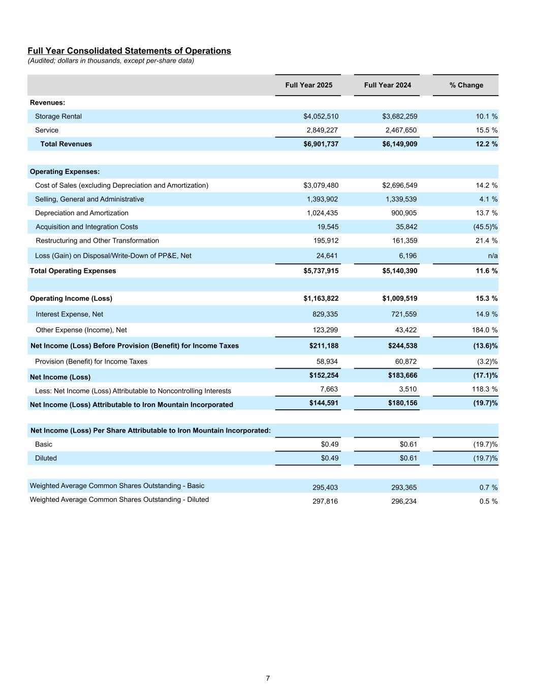 Full Year Consolidated Statements of Operations (Audited; dollars in thousands, except per-share data) Full Year 2025 Full Year 2024 % Change Revenues: Storage Rental $4,052,510 $3,682,259 10.1 % Service 2,849,227 2,467,650 15.5 % Total Revenues $6,901,737 $6,149,909 12.2 % Operating Expenses: Cost of Sales (excluding Depreciation and Amortization) $3,079,480 $2,696,549 14.2 % Selling, General and Administrative 1,393,902 1,339,539 4.1 % Depreciation and Amortization 1,024,435 900,905 13.7 % Acquisition and Integration Costs 19,545 35,842 (45.5) % Restructuring and Other Transformation 195,912 161,359 21.4 % Loss (Gain) on Disposal/Write-Down of PP&E, Net 24,641 6,196 n/a Total Operating Expenses $5,737,915 $5,140,390 11.6 % Operating Income (Loss) $1,163,822 $1,009,519 15.3 % Interest Expense, Net 829,335 721,559 14.9 % Other Expense (Income), Net 123,299 43,422 184.0 % Net Income (Loss) Before Provision (Benefit) for Income Taxes $211,188 $244,538 (13.6) % Provision (Benefit) for Income Taxes 58,934 60,872 (3.2) % Net Income (Loss) $152,254 $183,666 (17.1) % Less: Net Income (Loss) Attributable to Noncontrolling Interests 7,663 3,510 118.3 % Net Income (Loss) Attributable to Iron Mountain Incorporated $144,591 $180,156 (19.7) % Net Income (Loss) Per Share Attributable to Iron Mountain Incorporated: Basic $0.49 $0.61 (19.7) % Diluted $0.49 $0.61 (19.7) % Weighted Average Common Shares Outstanding - Basic 295,403 293,365 0.7 % Weighted Average Common Shares Outstanding - Diluted 297,816 296,234 0.5 % 7