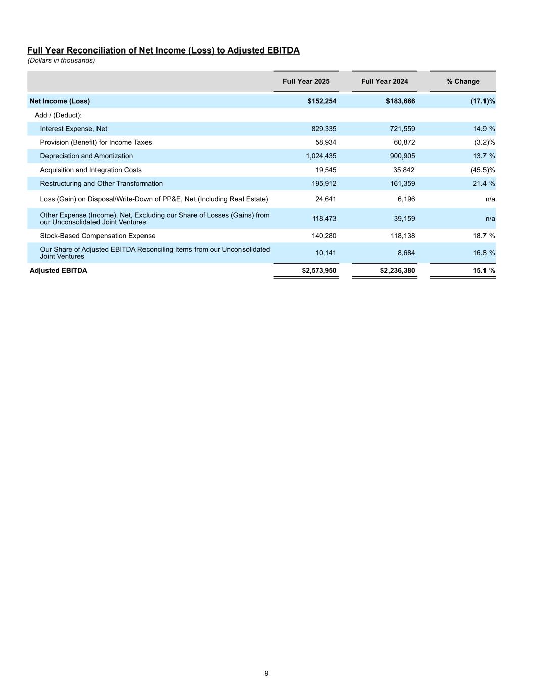 Full Year Reconciliation of Net Income (Loss) to Adjusted EBITDA (Dollars in thousands) Full Year 2025 Full Year 2024 % Change Net Income (Loss) $152,254 $183,666 (17.1) % Add / (Deduct): Interest Expense, Net 829,335 721,559 14.9 % Provision (Benefit) for Income Taxes 58,934 60,872 (3.2) % Depreciation and Amortization 1,024,435 900,905 13.7 % Acquisition and Integration Costs 19,545 35,842 (45.5) % Restructuring and Other Transformation 195,912 161,359 21.4 % Loss (Gain) on Disposal/Write-Down of PP&E, Net (Including Real Estate) 24,641 6,196 n/a Other Expense (Income), Net, Excluding our Share of Losses (Gains) from our Unconsolidated Joint Ventures 118,473 39,159 n/a Stock-Based Compensation Expense 140,280 118,138 18.7 % Our Share of Adjusted EBITDA Reconciling Items from our Unconsolidated Joint Ventures 10,141 8,684 16.8 % Adjusted EBITDA $2,573,950 $2,236,380 15.1 % 9