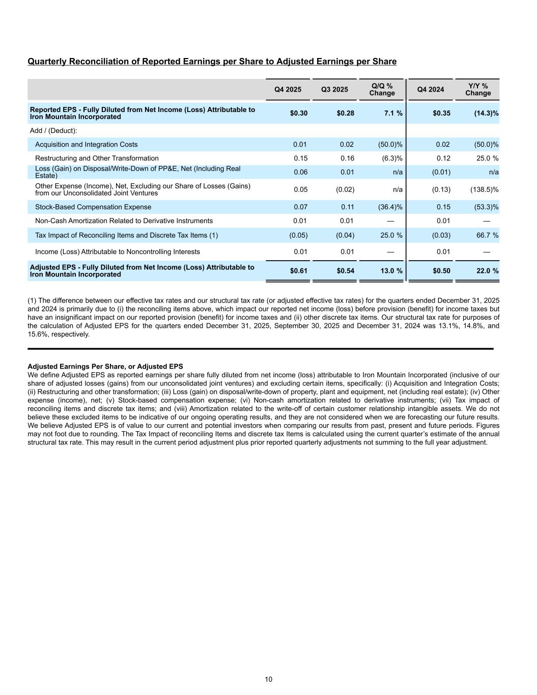 Quarterly Reconciliation of Reported Earnings per Share to Adjusted Earnings per Share Q4 2025 Q3 2025 Q/Q % Change Q4 2024 Y/Y % Change Reported EPS - Fully Diluted from Net Income (Loss) Attributable to Iron Mountain Incorporated $0.30 $0.28 7.1 % $0.35 (14.3) % Add / (Deduct): Acquisition and Integration Costs 0.01 0.02 (50.0) % 0.02 (50.0) % Restructuring and Other Transformation 0.15 0.16 (6.3) % 0.12 25.0 % Loss (Gain) on Disposal/Write-Down of PP&E, Net (Including Real Estate) 0.06 0.01 n/a (0.01) n/a Other Expense (Income), Net, Excluding our Share of Losses (Gains) from our Unconsolidated Joint Ventures 0.05 (0.02) n/a (0.13) (138.5) % Stock-Based Compensation Expense 0.07 0.11 (36.4) % 0.15 (53.3) % Non-Cash Amortization Related to Derivative Instruments 0.01 0.01 — 0.01 — Tax Impact of Reconciling Items and Discrete Tax Items (1) (0.05) (0.04) 25.0 % (0.03) 66.7 % Income (Loss) Attributable to Noncontrolling Interests 0.01 0.01 — 0.01 — Adjusted EPS - Fully Diluted from Net Income (Loss) Attributable to Iron Mountain Incorporated $0.61 $0.54 13.0 % $0.50 22.0 % (1) The difference between our effective tax rates and our structural tax rate (or adjusted effective tax rates) for the quarters ended December 31, 2025 and 2024 is primarily due to (i) the reconciling items above, which impact our reported net income (loss) before provision (benefit) for income taxes but have an insignificant impact on our reported provision (benefit) for income taxes and (ii) other discrete tax items. Our structural tax rate for purposes of the calculation of Adjusted EPS for the quarters ended December 31, 2025, September 30, 2025 and December 31, 2024 was 13.1%, 14.8%, and 15.6%, respectively. Adjusted Earnings Per Share, or Adjusted EPS We define Adjusted EPS as reported earnings per share fully diluted from net income (loss) attributable to Iron Mountain Incorporated (inclusive of our share of adjusted losses (gains) from our unconsolidated joint ventures) and excluding certain items, specifically: (i) Acquisition and Integration Costs; (ii) Restructuring and other transformation; (iii) Loss (gain) on disposal/write-down of property, plant and equipment, net (including real estate); (iv) Other expense (income), net; (v) Stock-based compensation expense; (vi) Non-cash amortization related to derivative instruments; (vii) Tax impact of reconciling items and discrete tax items; and (viii) Amortization related to the write-off of certain customer relationship intangible assets. We do not believe these excluded items to be indicative of our ongoing operating results, and they are not considered when we are forecasting our future results. We believe Adjusted EPS is of value to our current and potential investors when comparing our results from past, present and future periods. Figures may not foot due to rounding. The Tax Impact of reconciling Items and discrete tax Items is calculated using the current quarter’s estimate of the annual structural tax rate. This may result in the current period adjustment plus prior reported quarterly adjustments not summing to the full year adjustment. 10