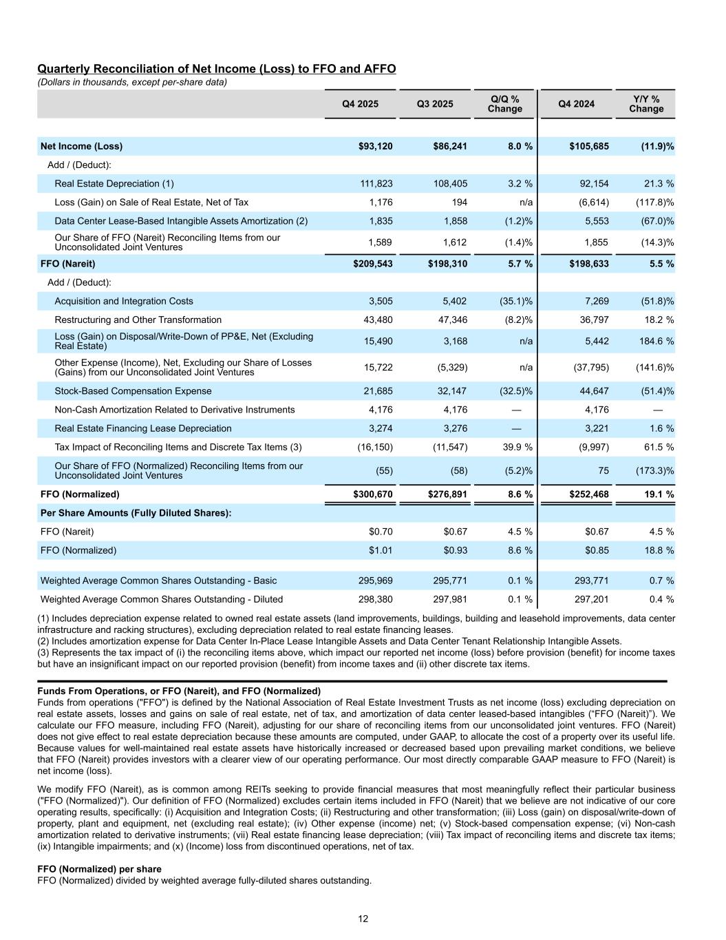 Quarterly Reconciliation of Net Income (Loss) to FFO and AFFO (Dollars in thousands, except per-share data) Q4 2025 Q3 2025 Q/Q % Change Q4 2024 Y/Y % Change Net Income (Loss) $93,120 $86,241 8.0 % $105,685 (11.9) % Add / (Deduct): Real Estate Depreciation (1) 111,823 108,405 3.2 % 92,154 21.3 % Loss (Gain) on Sale of Real Estate, Net of Tax 1,176 194 n/a (6,614) (117.8) % Data Center Lease-Based Intangible Assets Amortization (2) 1,835 1,858 (1.2) % 5,553 (67.0) % Our Share of FFO (Nareit) Reconciling Items from our Unconsolidated Joint Ventures 1,589 1,612 (1.4) % 1,855 (14.3) % FFO (Nareit) $209,543 $198,310 5.7 % $198,633 5.5 % Add / (Deduct): Acquisition and Integration Costs 3,505 5,402 (35.1) % 7,269 (51.8) % Restructuring and Other Transformation 43,480 47,346 (8.2) % 36,797 18.2 % Loss (Gain) on Disposal/Write-Down of PP&E, Net (Excluding Real Estate) 15,490 3,168 n/a 5,442 184.6 % Other Expense (Income), Net, Excluding our Share of Losses (Gains) from our Unconsolidated Joint Ventures 15,722 (5,329) n/a (37,795) (141.6) % Stock-Based Compensation Expense 21,685 32,147 (32.5) % 44,647 (51.4) % Non-Cash Amortization Related to Derivative Instruments 4,176 4,176 — 4,176 — Real Estate Financing Lease Depreciation 3,274 3,276 — 3,221 1.6 % Tax Impact of Reconciling Items and Discrete Tax Items (3) (16,150) (11,547) 39.9 % (9,997) 61.5 % Our Share of FFO (Normalized) Reconciling Items from our Unconsolidated Joint Ventures (55) (58) (5.2) % 75 (173.3) % FFO (Normalized) $300,670 $276,891 8.6 % $252,468 19.1 % Per Share Amounts (Fully Diluted Shares): FFO (Nareit) $0.70 $0.67 4.5 % $0.67 4.5 % FFO (Normalized) $1.01 $0.93 8.6 % $0.85 18.8 % Weighted Average Common Shares Outstanding - Basic 295,969 295,771 0.1 % 293,771 0.7 % Weighted Average Common Shares Outstanding - Diluted 298,380 297,981 0.1 % 297,201 0.4 % (1) Includes depreciation expense related to owned real estate assets (land improvements, buildings, building and leasehold improvements, data center infrastructure and racking structures), excluding depreciation related to real estate financing leases. (2) Includes amortization expense for Data Center In-Place Lease Intangible Assets and Data Center Tenant Relationship Intangible Assets. (3) Represents the tax impact of (i) the reconciling items above, which impact our reported net income (loss) before provision (benefit) for income taxes but have an insignificant impact on our reported provision (benefit) from income taxes and (ii) other discrete tax items. Funds From Operations, or FFO (Nareit), and FFO (Normalized) Funds from operations ("FFO") is defined by the National Association of Real Estate Investment Trusts as net income (loss) excluding depreciation on real estate assets, losses and gains on sale of real estate, net of tax, and amortization of data center leased-based intangibles (“FFO (Nareit)”). We calculate our FFO measure, including FFO (Nareit), adjusting for our share of reconciling items from our unconsolidated joint ventures. FFO (Nareit) does not give effect to real estate depreciation because these amounts are computed, under GAAP, to allocate the cost of a property over its useful life. Because values for well-maintained real estate assets have historically increased or decreased based upon prevailing market conditions, we believe that FFO (Nareit) provides investors with a clearer view of our operating performance. Our most directly comparable GAAP measure to FFO (Nareit) is net income (loss). We modify FFO (Nareit), as is common among REITs seeking to provide financial measures that most meaningfully reflect their particular business ("FFO (Normalized)"). Our definition of FFO (Normalized) excludes certain items included in FFO (Nareit) that we believe are not indicative of our core operating results, specifically: (i) Acquisition and Integration Costs; (ii) Restructuring and other transformation; (iii) Loss (gain) on disposal/write-down of property, plant and equipment, net (excluding real estate); (iv) Other expense (income) net; (v) Stock-based compensation expense; (vi) Non-cash amortization related to derivative instruments; (vii) Real estate financing lease depreciation; (viii) Tax impact of reconciling items and discrete tax items; (ix) Intangible impairments; and (x) (Income) loss from discontinued operations, net of tax. FFO (Normalized) per share FFO (Normalized) divided by weighted average fully-diluted shares outstanding. 12