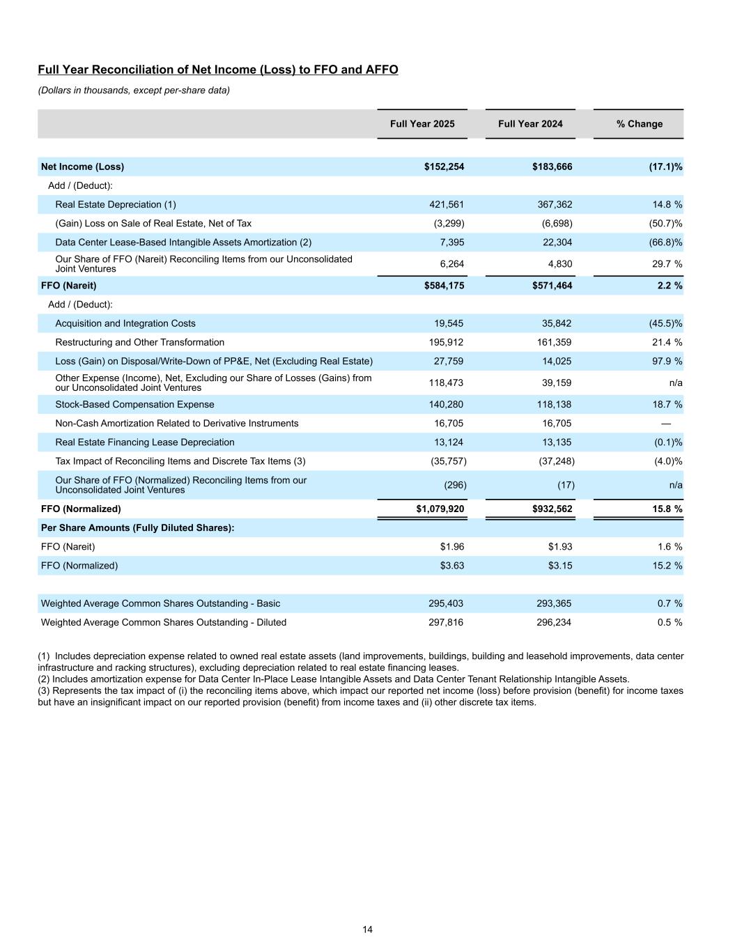 Full Year Reconciliation of Net Income (Loss) to FFO and AFFO (Dollars in thousands, except per-share data) Full Year 2025 Full Year 2024 % Change Net Income (Loss) $152,254 $183,666 (17.1) % Add / (Deduct): Real Estate Depreciation (1) 421,561 367,362 14.8 % (Gain) Loss on Sale of Real Estate, Net of Tax (3,299) (6,698) (50.7) % Data Center Lease-Based Intangible Assets Amortization (2) 7,395 22,304 (66.8) % Our Share of FFO (Nareit) Reconciling Items from our Unconsolidated Joint Ventures 6,264 4,830 29.7 % FFO (Nareit) $584,175 $571,464 2.2 % Add / (Deduct): Acquisition and Integration Costs 19,545 35,842 (45.5) % Restructuring and Other Transformation 195,912 161,359 21.4 % Loss (Gain) on Disposal/Write-Down of PP&E, Net (Excluding Real Estate) 27,759 14,025 97.9 % Other Expense (Income), Net, Excluding our Share of Losses (Gains) from our Unconsolidated Joint Ventures 118,473 39,159 n/a Stock-Based Compensation Expense 140,280 118,138 18.7 % Non-Cash Amortization Related to Derivative Instruments 16,705 16,705 — Real Estate Financing Lease Depreciation 13,124 13,135 (0.1) % Tax Impact of Reconciling Items and Discrete Tax Items (3) (35,757) (37,248) (4.0) % Our Share of FFO (Normalized) Reconciling Items from our Unconsolidated Joint Ventures (296) (17) n/a FFO (Normalized) $1,079,920 $932,562 15.8 % Per Share Amounts (Fully Diluted Shares): FFO (Nareit) $1.96 $1.93 1.6 % FFO (Normalized) $3.63 $3.15 15.2 % Weighted Average Common Shares Outstanding - Basic 295,403 293,365 0.7 % Weighted Average Common Shares Outstanding - Diluted 297,816 296,234 0.5 % (1) Includes depreciation expense related to owned real estate assets (land improvements, buildings, building and leasehold improvements, data center infrastructure and racking structures), excluding depreciation related to real estate financing leases. (2) Includes amortization expense for Data Center In-Place Lease Intangible Assets and Data Center Tenant Relationship Intangible Assets. (3) Represents the tax impact of (i) the reconciling items above, which impact our reported net income (loss) before provision (benefit) for income taxes but have an insignificant impact on our reported provision (benefit) from income taxes and (ii) other discrete tax items. 14