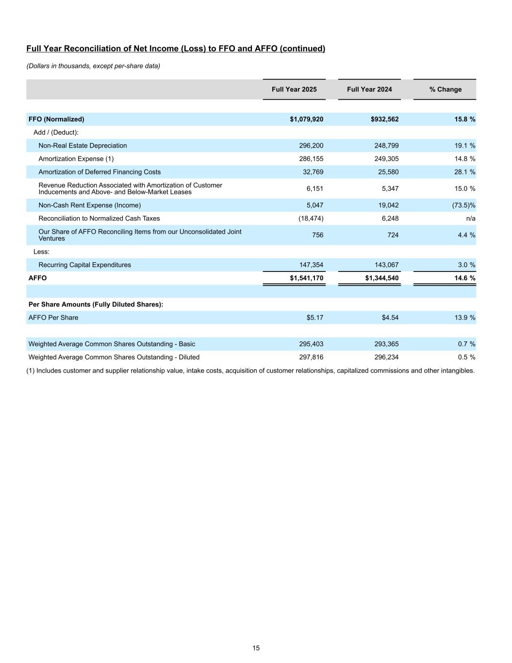 Full Year Reconciliation of Net Income (Loss) to FFO and AFFO (continued) (Dollars in thousands, except per-share data) Full Year 2025 Full Year 2024 % Change FFO (Normalized) $1,079,920 $932,562 15.8 % Add / (Deduct): Non-Real Estate Depreciation 296,200 248,799 19.1 % Amortization Expense (1) 286,155 249,305 14.8 % Amortization of Deferred Financing Costs 32,769 25,580 28.1 % Revenue Reduction Associated with Amortization of Customer Inducements and Above- and Below-Market Leases 6,151 5,347 15.0 % Non-Cash Rent Expense (Income) 5,047 19,042 (73.5) % Reconciliation to Normalized Cash Taxes (18,474) 6,248 n/a Our Share of AFFO Reconciling Items from our Unconsolidated Joint Ventures 756 724 4.4 % Less: Recurring Capital Expenditures 147,354 143,067 3.0 % AFFO $1,541,170 $1,344,540 14.6 % Per Share Amounts (Fully Diluted Shares): AFFO Per Share $5.17 $4.54 13.9 % Weighted Average Common Shares Outstanding - Basic 295,403 293,365 0.7 % Weighted Average Common Shares Outstanding - Diluted 297,816 296,234 0.5 % (1) Includes customer and supplier relationship value, intake costs, acquisition of customer relationships, capitalized commissions and other intangibles. 15
