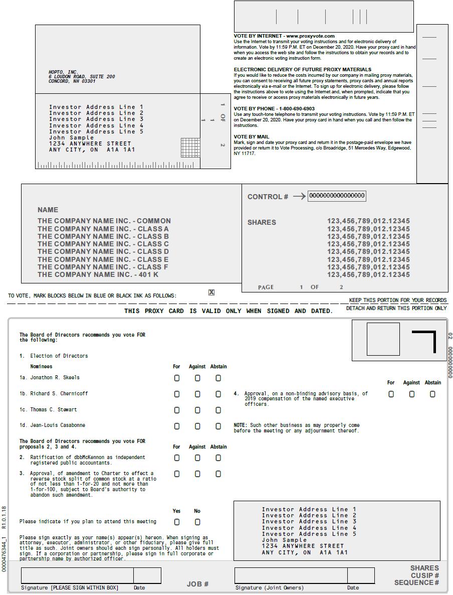 We are furnishing you this proxy statement in connection with the solicitation of proxies by the Board of Directors (the “Board”) of HopTo, Inc., a Delaware corporation (the “Corporation”, “Company”, “we”, “us”, or “our”). This proxy statement addresses the items of business for the 2020 Annual Stockholders’ Meeting m of the Corporation (the “Annual Meeting”) to be held on December 21, 2020, or any postponement or adjournment thereof. We will hold the Annual Meeting at 9:00 a.m., at 620 Newport Center Drive, 11th Floor, Newport Beach, CA 92660. The Notice of Annual Stockholders’ Meeting, this proxy statement, our Annual Report on Form 10-K for the fiscal year ended December 31, 2019, a proxy card and any other accompanying proxy materials are being made available to our stockholders on or about November 24, 2020.