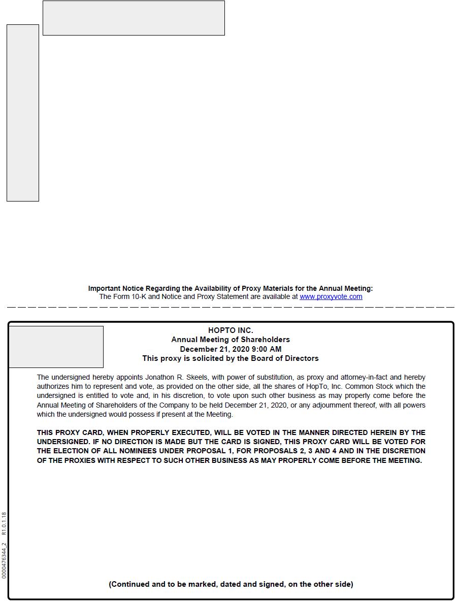 We invite you to join us at the 2020 Annual Stockholders’ Meeting (the “Annual Meeting”) of HopTo, Inc., on December 21, 2020, beginning at 9:00 a.m. local time, at 620 Newport Center Drive, 11th Floor, Newport Beach, CA 92660.