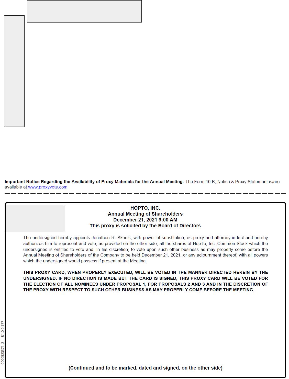 We invite you to join us at the 2021 Annual Stockholders’ Meeting (the “Annual Meeting”) of HopTo, Inc., on December 21, 2021, beginning at 9:00 a.m. local time, at 620 Newport Center Drive, 11th Floor, Newport Beach, CA 92660.