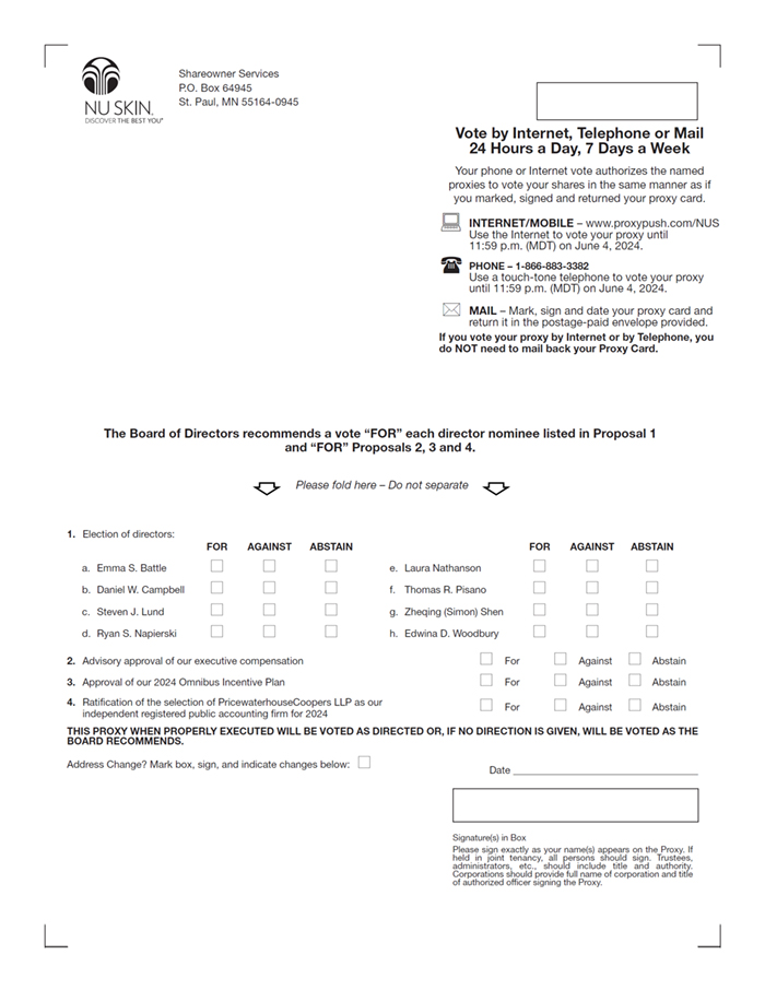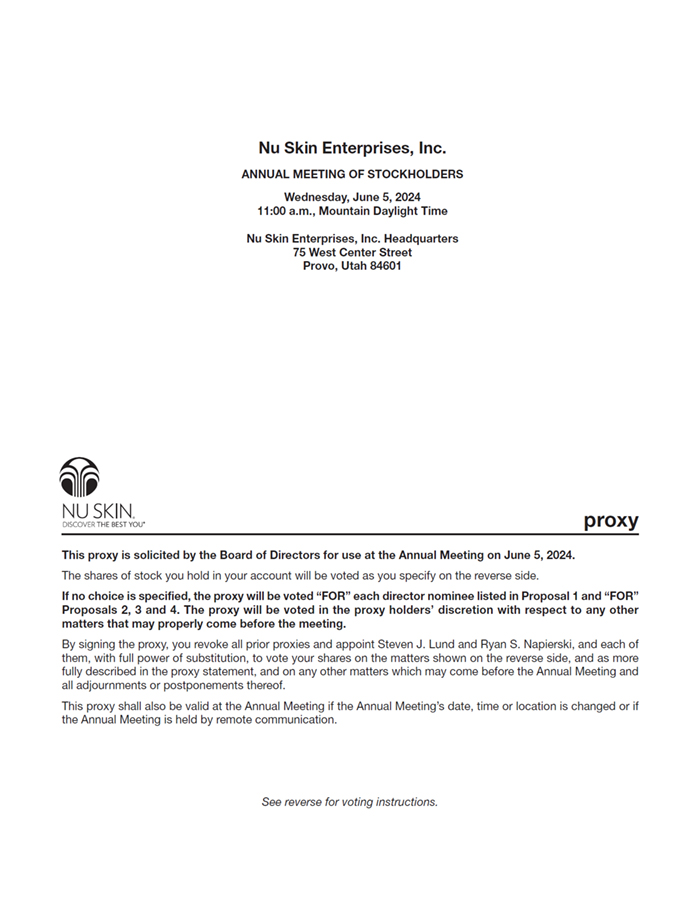 The accompanying proxy is solicited on behalf of the Board of Directors of Nu Skin Enterprises, Inc. (“Nu Skin,” “we,” “us,” or “the company”) for use at the Annual Meeting of Stockholders (the “Annual Meeting”) on June 5, 2024 at 11:00 a.m., Mountain Daylight Time, and at any adjournment or postponement thereof. The Annual Meeting will be held at our corporate offices, 75 West Center Street, Provo, Utah 84601.