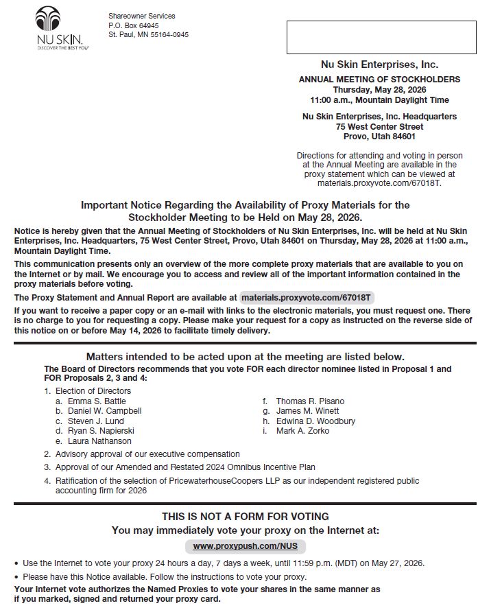 Shareowner Services P.O. Box 64945 St. Paul, MN 55164-0945 Nu Skin Enterprises, Inc. ANNUAL MEETING OF STOCKHOLDERS Thursday, May 28, 2026 11:00 a.m., Mountain Daylight