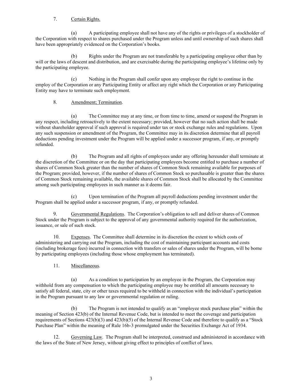 3 7. Certain Rights. (a) A participating employee shall not have any of the rights or privileges of a stockholder of the Corporation with respect to shares purchased under the Program unless and until ownership of such shares shall have been appropriately evidenced on the Corporation’s books. (b) Rights under the Program are not transferable by a participating employee other than by will or the laws of descent and distribution, and are exercisable during the participating employee’s lifetime only by the participating employee. (c) Nothing in the Program shall confer upon any employee the right to continue in the employ of the Corporation or any Participating Entity or affect any right which the Corporation or any Participating Entity may have to terminate such employment. 8. Amendment; Termination. (a) The Committee may at any time, or from time to time, amend or suspend the Program in any respect, including retroactively to the extent necessary; provided, however that no such action shall be made without shareholder approval if such approval is required under tax or stock exchange rules and regulations. Upon any such suspension or amendment of the Program, the Committee may in its discretion determine that all payroll deductions pending investment under the Program will be applied under a successor program, if any, or promptly refunded. (b) The Program and all rights of employees under any offering hereunder shall terminate at the discretion of the Committee or on the day that participating employees become entitled to purchase a number of shares of Common Stock greater than the number of shares of Common Stock remaining available for purposes of the Program; provided, however, if the number of shares of Common Stock so purchasable is greater than the shares of Common Stock remaining available, the available shares of Common Stock shall be allocated by the Committee among such participating employees in such manner as it deems fair. (c) Upon termination of the Program all payroll deductions pending investment under the Program shall be applied under a successor program, if any, or promptly refunded. 9. Governmental Regulations. The Corporation’s obligation to sell and deliver shares of Common Stock under the Program is subject to the approval of any governmental authority required for the authorization, issuance, or sale of such stock. 10. Expenses. The Committee shall determine in its discretion the extent to which costs of administering and carrying out the Program, including the cost of maintaining participant accounts and costs (including brokerage fees) incurred in connection with transfers or sales of shares under the Program, will be borne by participating employees (including those whose employment has terminated). 11. Miscellaneous. (a) As a condition to participation by an employee in the Program, the Corporation may withhold from any compensation to which the participating employee may be entitled all amounts necessary to satisfy all federal, state, city or other taxes required to be withheld in connection with the individual’s participation in the Program pursuant to any law or governmental regulation or ruling. (b) The Program is not intended to qualify as an “employee stock purchase plan” within the meaning of Section 423(b) of the Internal Revenue Code, but is intended to meet the coverage and participation requirements of Sections 423(b)(3) and 423(b)(5) of the Internal Revenue Code and therefore to qualify as a “Stock Purchase Plan” within the meaning of Rule 16b-3 promulgated under the Securities Exchange Act of 1934. 12. Governing Law. The Program shall be interpreted, construed and administered in accordance with the laws of the State of New Jersey, without giving effect to principles of conflict of laws.