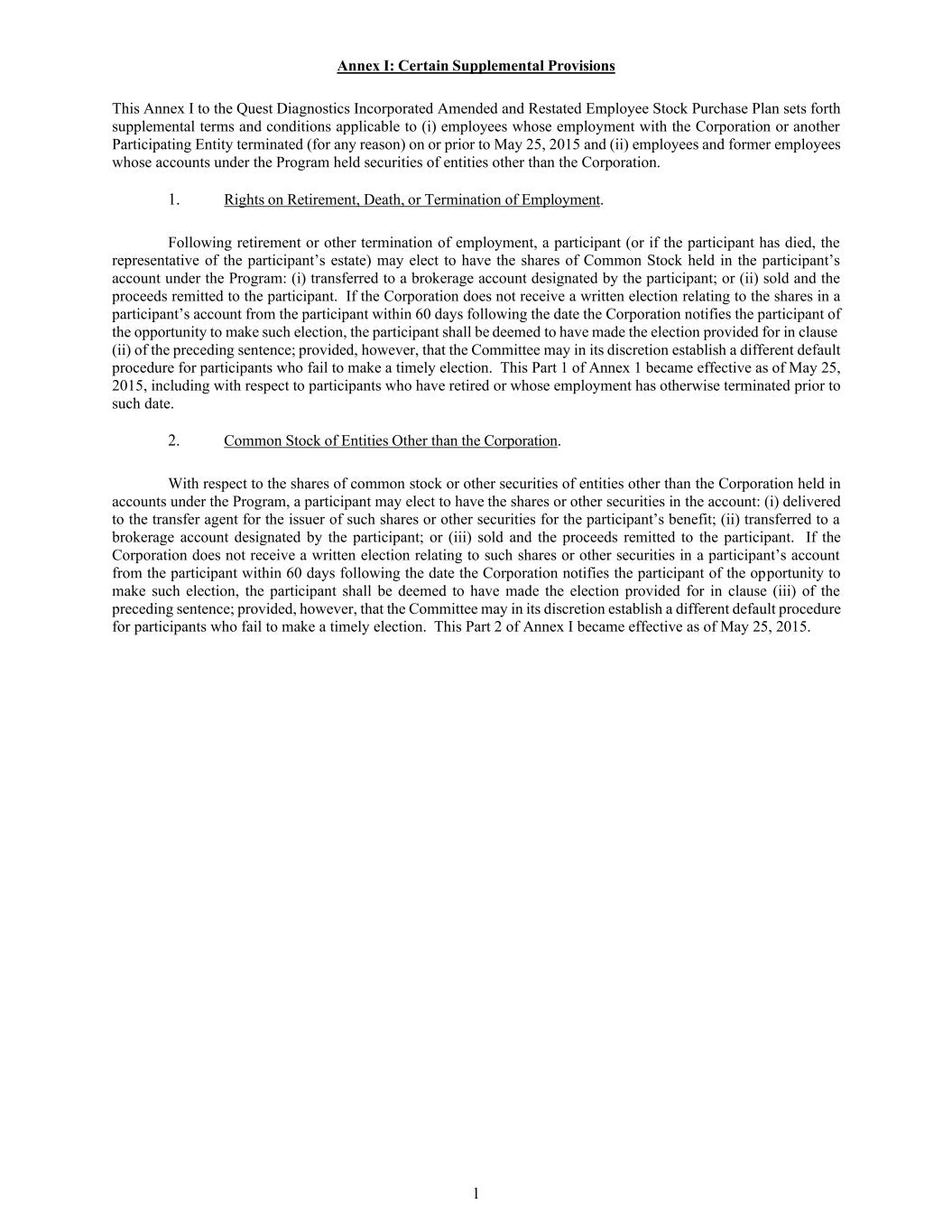 1 Annex I: Certain Supplemental Provisions This Annex I to the Quest Diagnostics Incorporated Amended and Restated Employee Stock Purchase Plan sets forth supplemental terms and conditions applicable to (i) employees whose employment with the Corporation or another Participating Entity terminated (for any reason) on or prior to May 25, 2015 and (ii) employees and former employees whose accounts under the Program held securities of entities other than the Corporation. 1. Rights on Retirement, Death, or Termination of Employment. Following retirement or other termination of employment, a participant (or if the participant has died, the representative of the participant’s estate) may elect to have the shares of Common Stock held in the participant’s account under the Program: (i) transferred to a brokerage account designated by the participant; or (ii) sold and the proceeds remitted to the participant. If the Corporation does not receive a written election relating to the shares in a participant’s account from the participant within 60 days following the date the Corporation notifies the participant of the opportunity to make such election, the participant shall be deemed to have made the election provided for in clause (ii) of the preceding sentence; provided, however, that the Committee may in its discretion establish a different default procedure for participants who fail to make a timely election. This Part 1 of Annex 1 became effective as of May 25, 2015, including with respect to participants who have retired or whose employment has otherwise terminated prior to such date. 2. Common Stock of Entities Other than the Corporation. With respect to the shares of common stock or other securities of entities other than the Corporation held in accounts under the Program, a participant may elect to have the shares or other securities in the account: (i) delivered to the transfer agent for the issuer of such shares or other securities for the participant’s benefit; (ii) transferred to a brokerage account designated by the participant; or (iii) sold and the proceeds remitted to the participant. If the Corporation does not receive a written election relating to such shares or other securities in a participant’s account from the participant within 60 days following the date the Corporation notifies the participant of the opportunity to make such election, the participant shall be deemed to have made the election provided for in clause (iii) of the preceding sentence; provided, however, that the Committee may in its discretion establish a different default procedure for participants who fail to make a timely election. This Part 2 of Annex I became effective as of May 25, 2015.