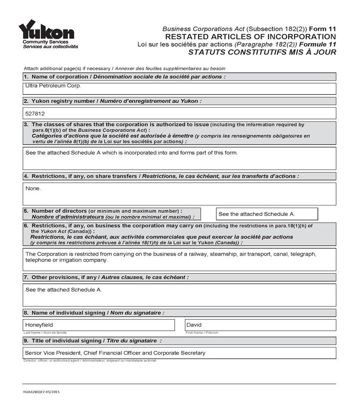 Business Corporations Act (Subsection 182(2)) Form 11 RESTATED ARTICLES OF INCORPORATION Loi sur les sociétés par actions (Paragraphe 182(2)) Formule 11 STATUTS CONSTITUTIFS MIS À JOUR Attach additional page(s) if necessary / Annexer des feuilles supplémentairesau besoin 1. Name of corporation / Dénomination sociale de la société par actions : Ultra Petroleum Corp. 2. Yukon registry number / Numéro d’enregistrement au Yukon : 527812 3. The classes of shares that the corporation is authorized to issue (including the information required by para.8(1)(b) of the Business Corporations Act) : Catégories d’actions que la société est autorisée à émettre (y compris les renseignements obligatoires en vertu de l’alinéa 8(1)(b) de la Loi sur les sociétés par actions) : See the attached Schedule A which is incorporated into and forms part of this form. 4. Restrictions, if any, on share transfers / Restrictions, le cas échéant, sur les transferts d’actions : None. 5. Number of directors (or minimum and maximum number) : See the attached Schedule A. Nombre d’administrateurs (ou le nombre minimal et maximal) : 6. Restrictions, if any, on business the corporation may carry on (including the restrictions in para.18(1)(h) of the Yukon Act (Canada)) : The Corporation is restricted from carrying on the business of a railway, steamship, air transport, canal, telegraph, telephone or irrigation company. Restrictions, le cas échéant, aux activités commerciales que peut exercer la société par actions (y compris les restrictions prévues à l’alinéa 18(1)h) de la Loi sur le Yukon (Canada)) : 7. Other provisions, if any / Autres clauses, le cas échéant : See the attached Schedule A. 8. Name of individual signing / Nom du signataire : Honeyfield, David Last Name / Nom de famille First Name / Prénom 9.Title of individual signing/ Titre du signataire : Senior Vice President, Chief Financial Officer and Corporate Secretary Director, officer, or authorized agent / Administrateur, dirigeant ou mandataire autorisé YG(6128Q)F2 03/2015