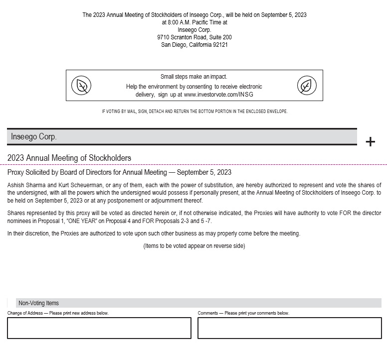You are cordially invited to attend the 2023 Annual Meeting of Stockholders (the “Annual Meeting”) of Inseego Corp., a Delaware corporation (the “Company”). The Annual Meeting will be held on September 5, 2023 at 8:00 a.m. Pacific Time, at the Company’s corporate offices located at 9710 Scranton Road, Suite 200, San Diego, California 92121.